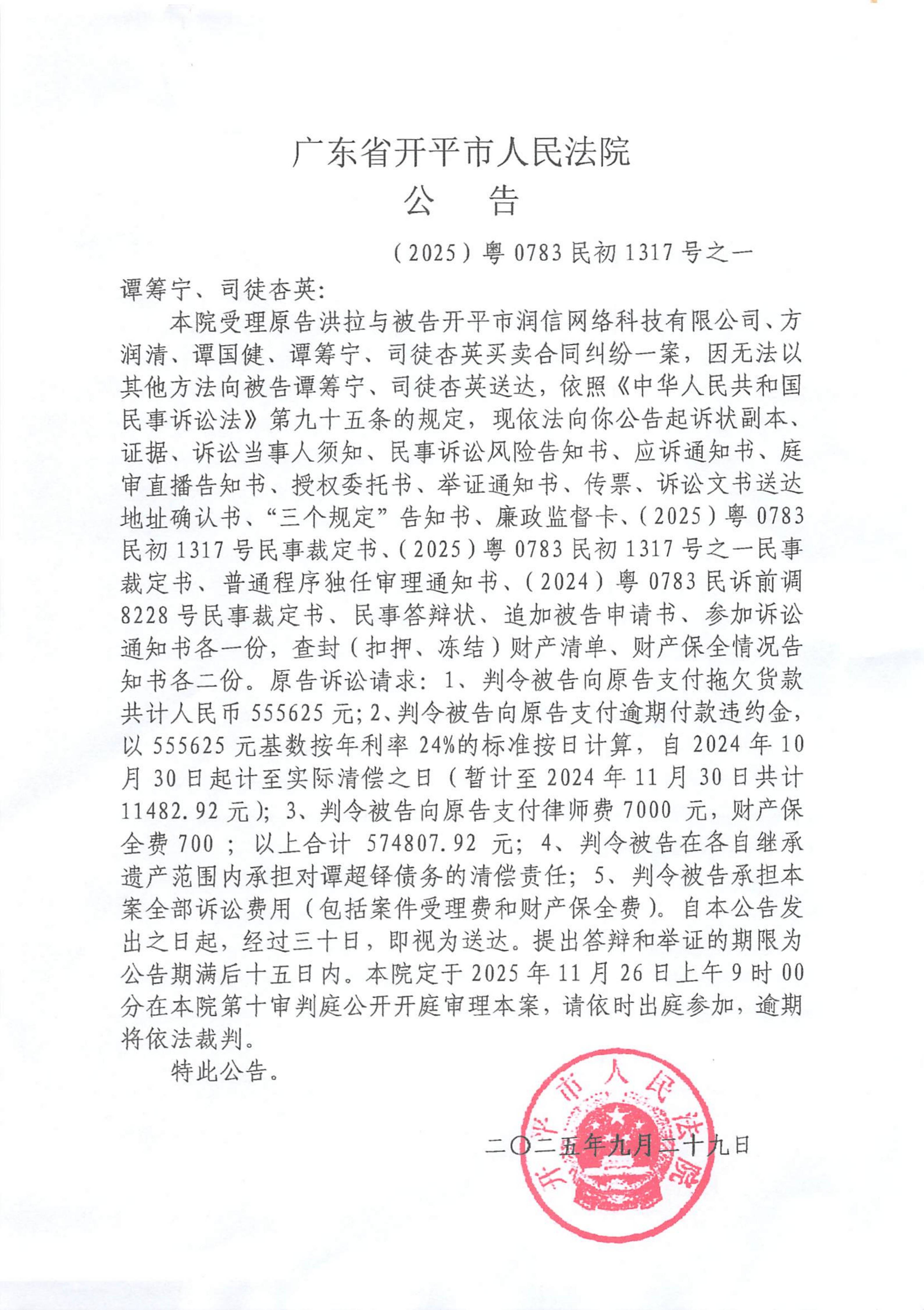 附件:(2025)粤0783民初1317号之一 谭筹宁、司徒杏英 开庭公告.pdf