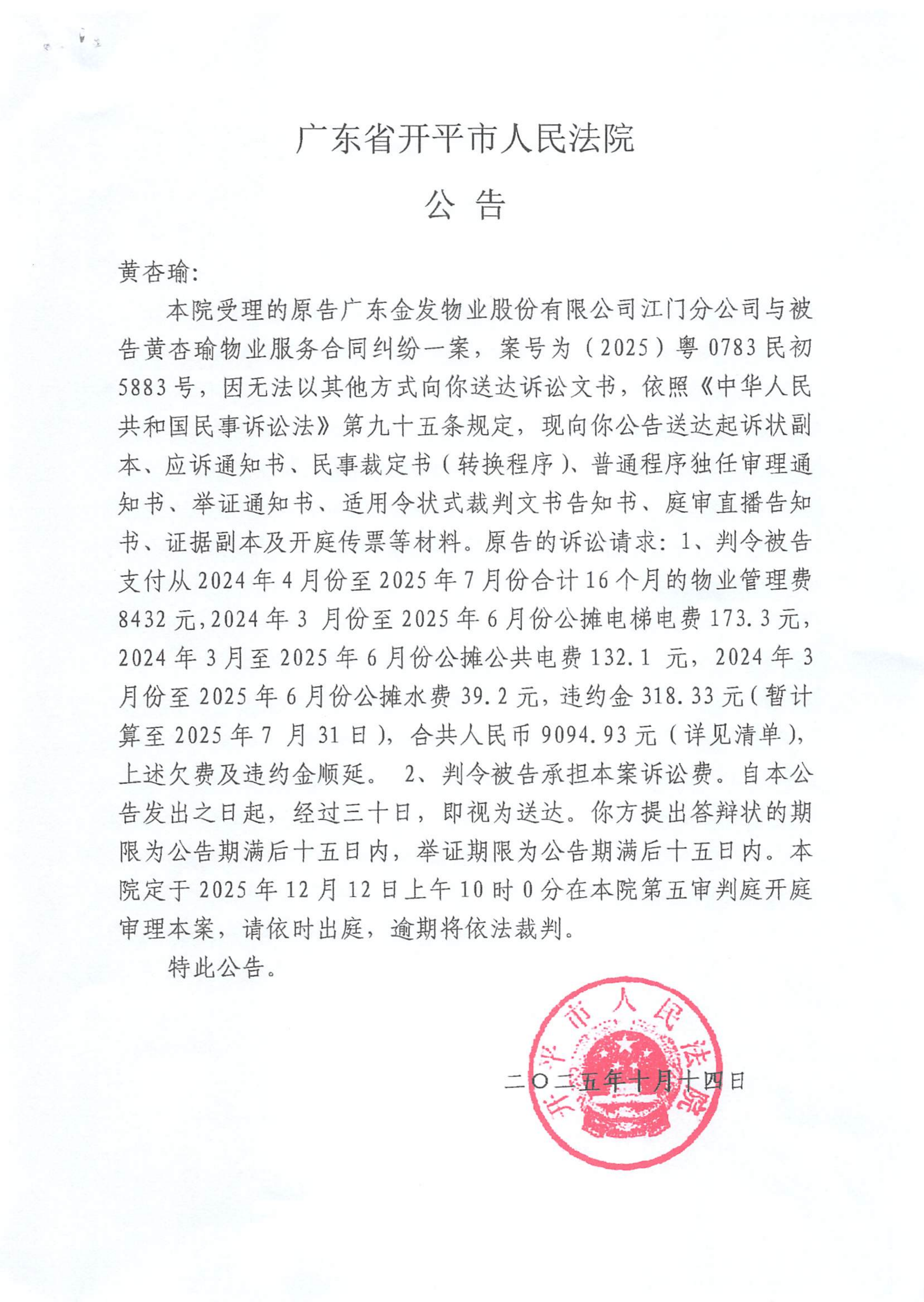 附件:(2025)粤0783民初5883号 黄杏瑜 开庭公告.pdf