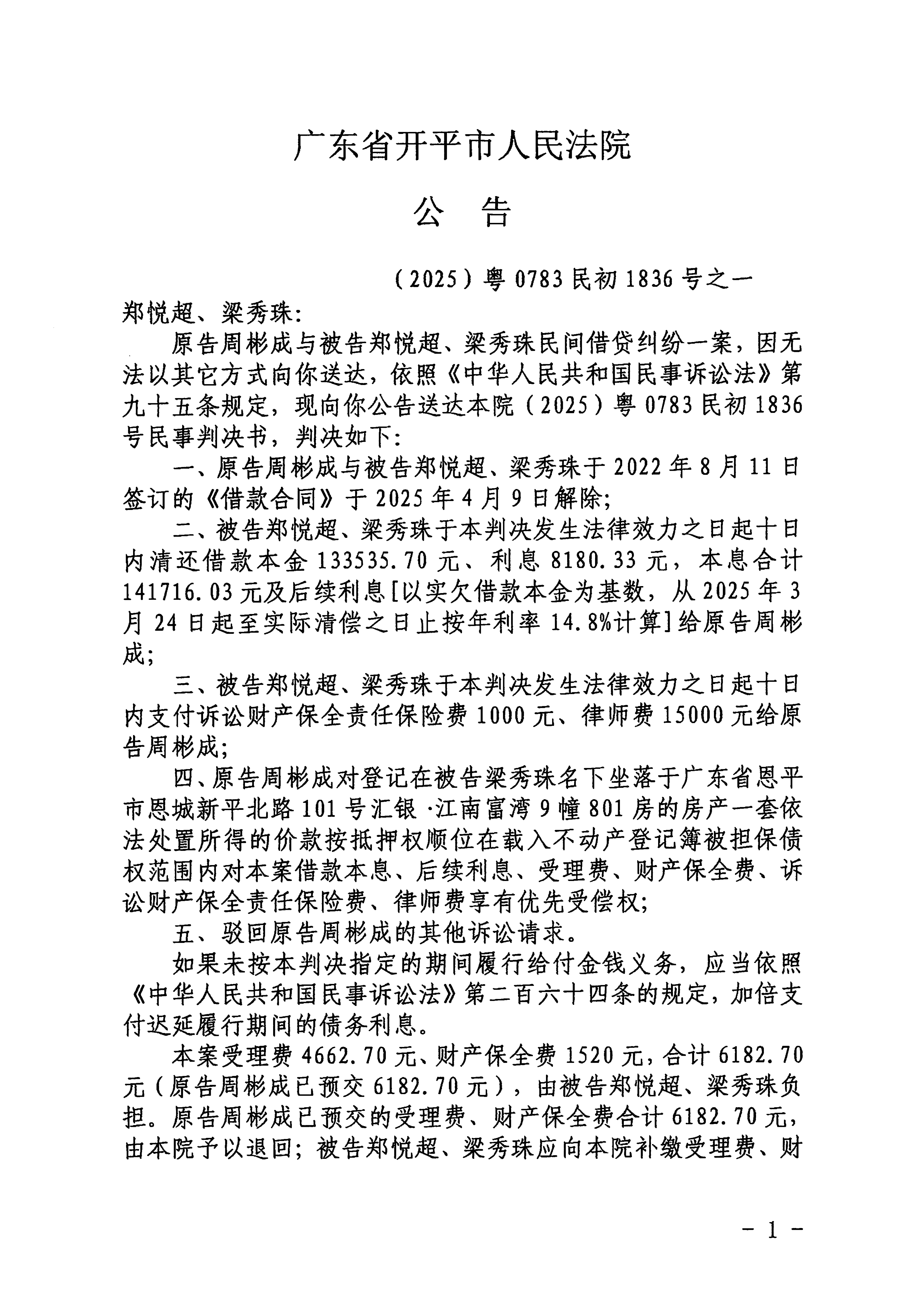 附件:(2025)粤0783民初1836号之一 郑悦超、梁秀珠 判决公告.pdf