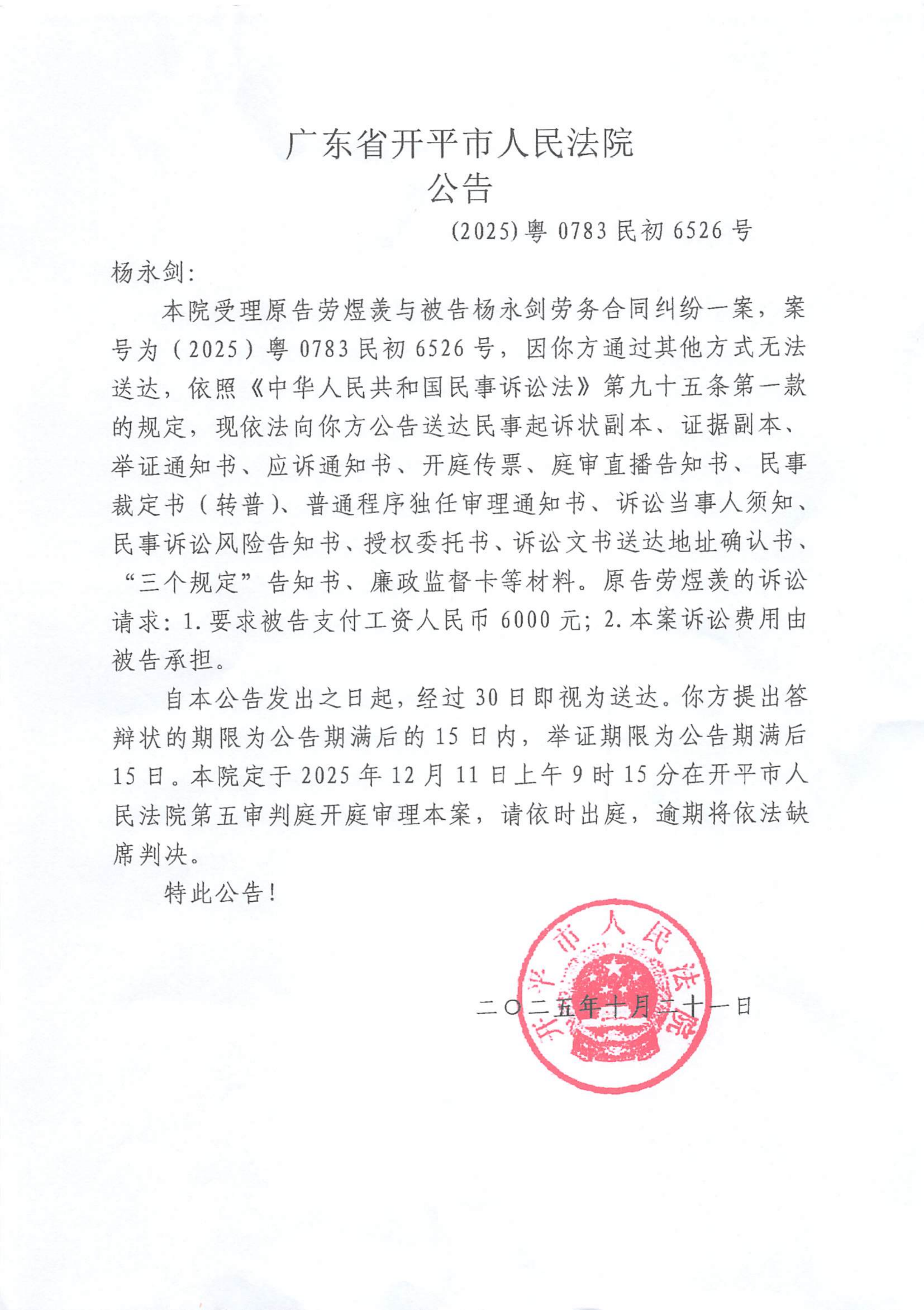 附件:(2025)粤0783民初6526号 杨永剑 开庭公告.pdf