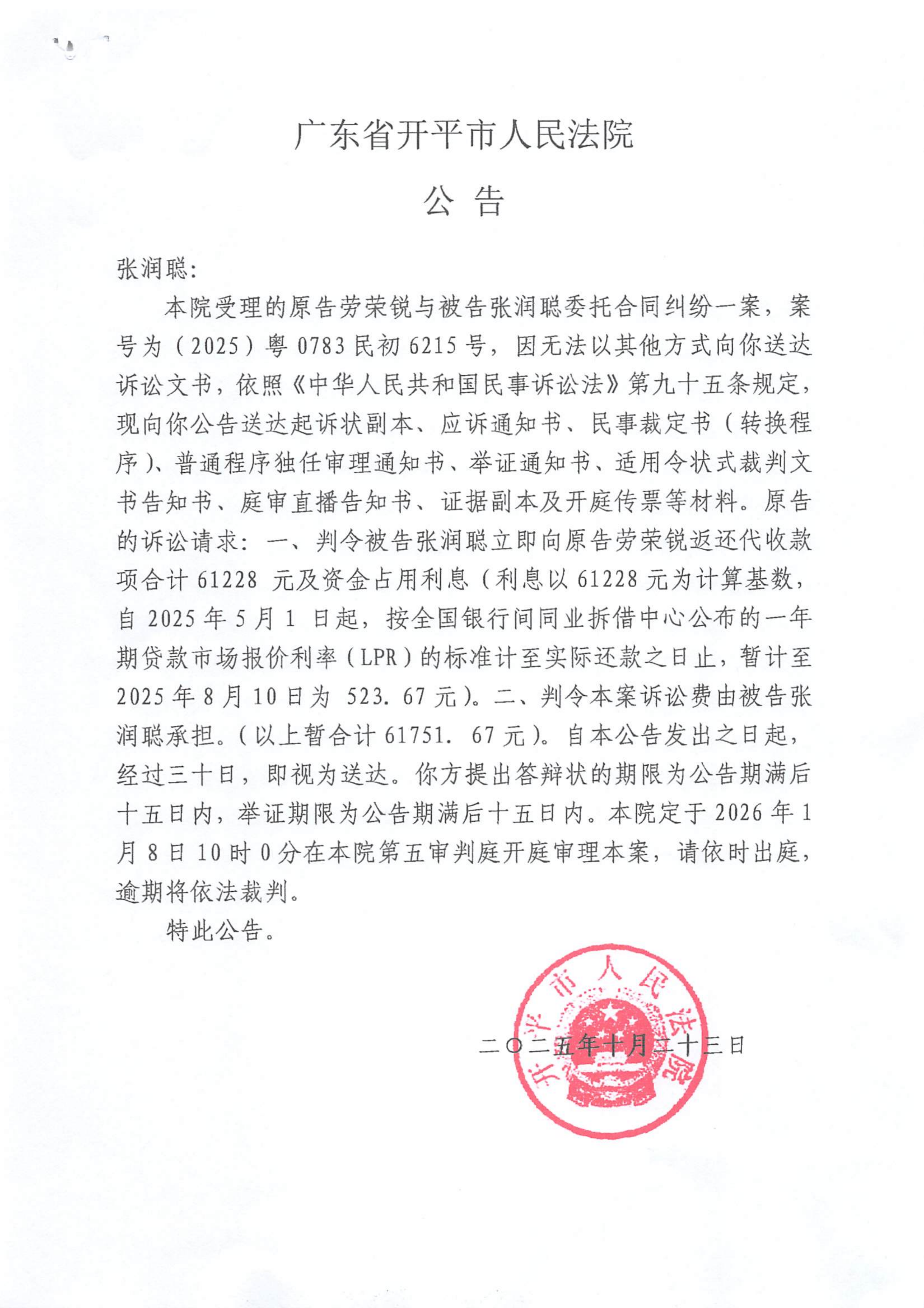 附件:(2025)粤0783民初6215号 张润聪 开庭公告.pdf