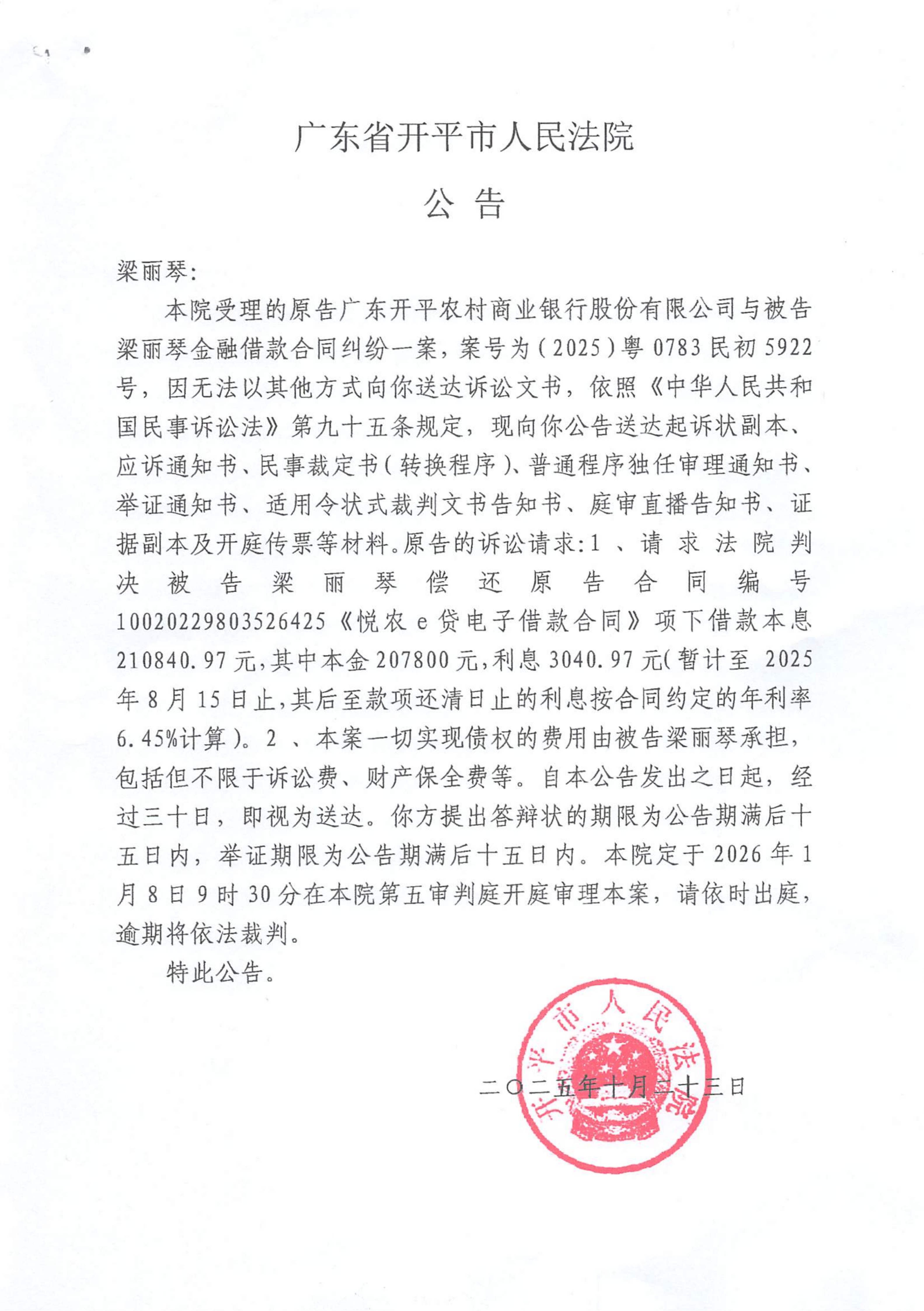 附件:(2025)粤0783民初5922号 梁丽琴 开庭公告.pdf