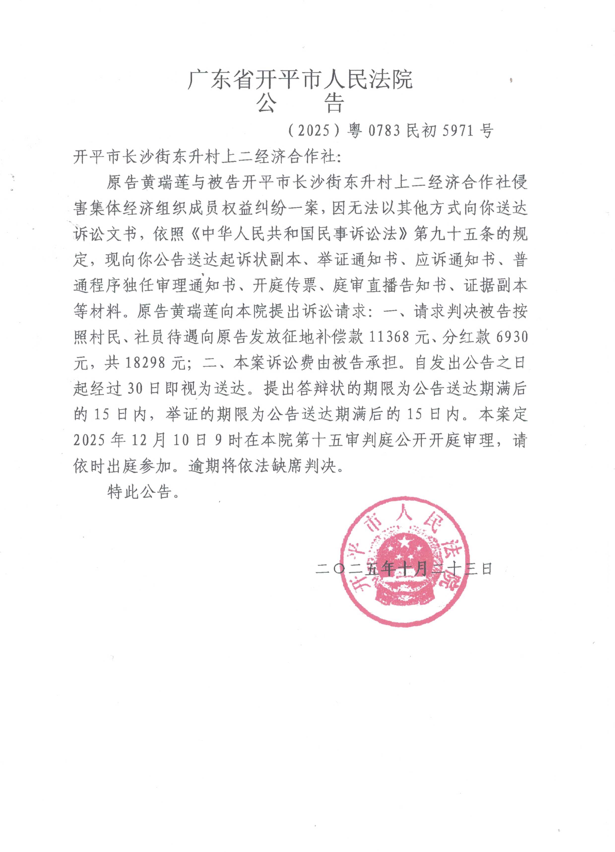 (2025)粤0783民初5971号 开平市长沙街东升村上二经济合作社 开庭公告