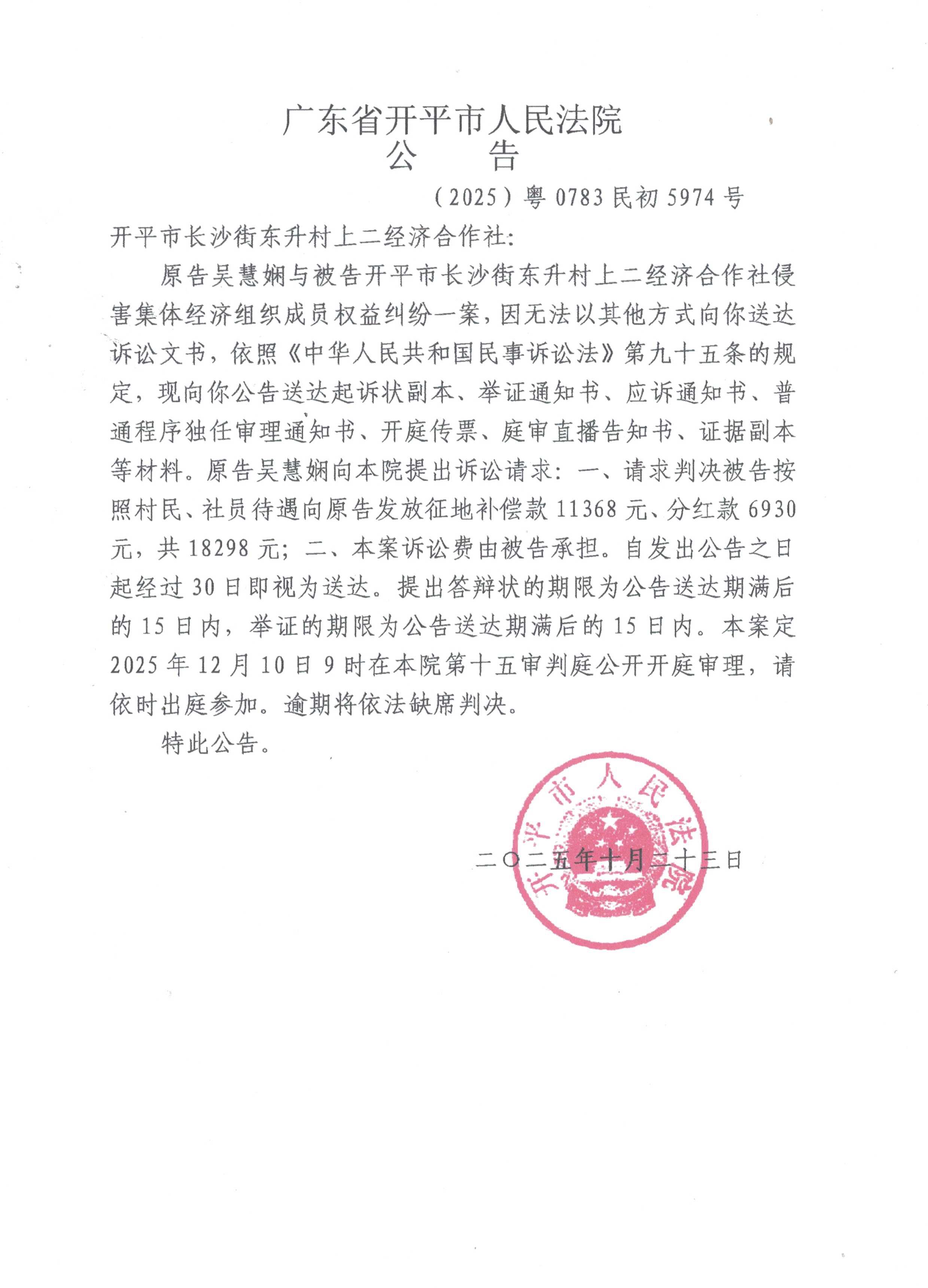 (2025)粤0783民初5974号 开平市长沙街东升村上二经济合作社 开庭公告