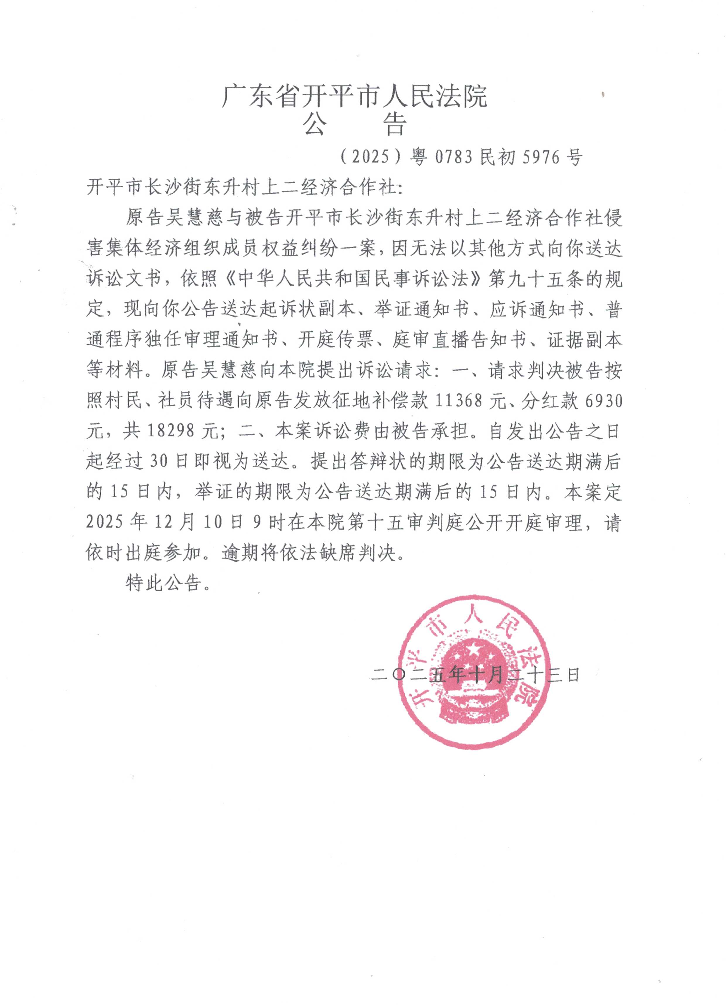 (2025)粤0783民初5976号 开平市长沙街东升村上二经济合作社 开庭公告