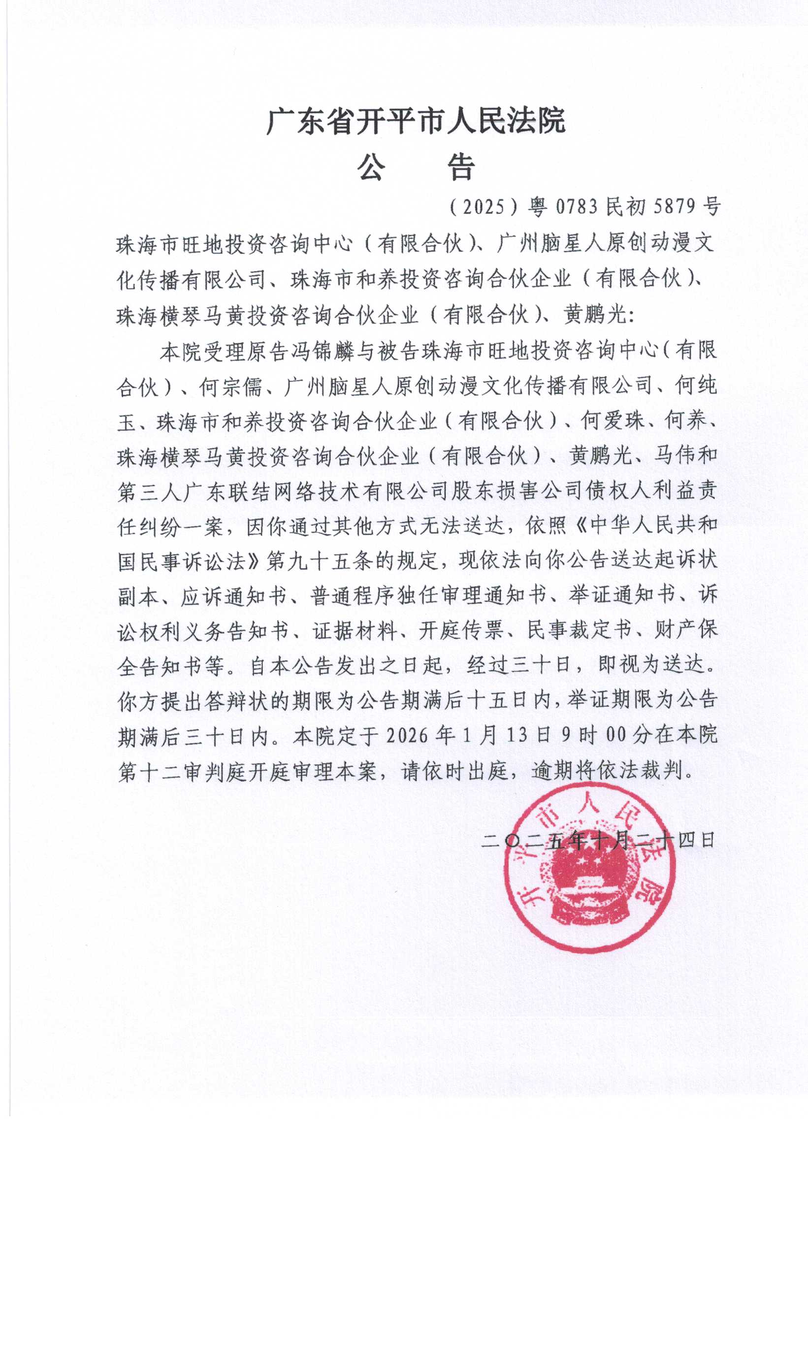 (2025)粤0783民初5879号珠海市旺地投资咨询中心(有限合伙)等传票公告
