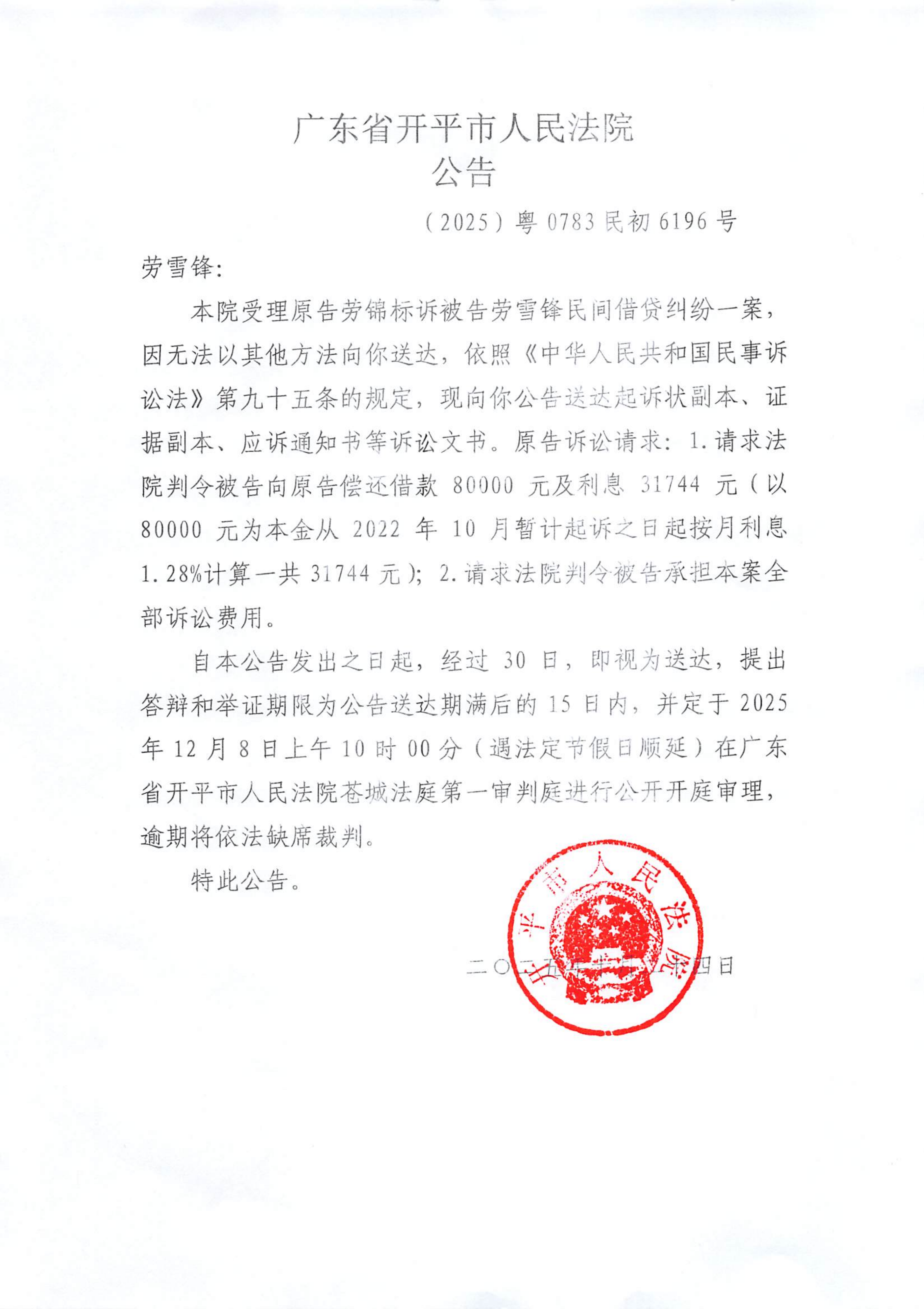 附件:(2025)粤0783民初6196号 劳雪锋 开庭公告.pdf