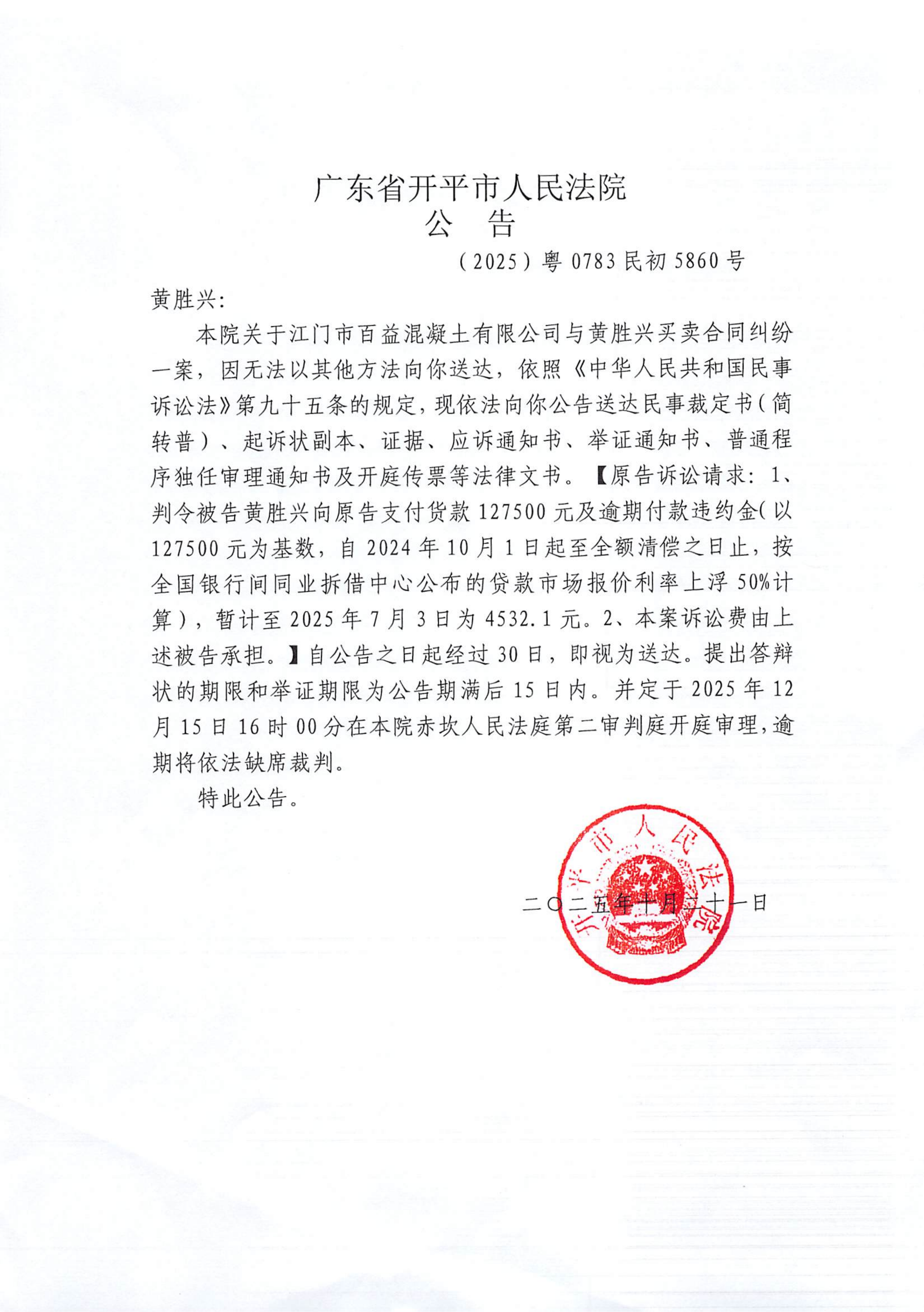 附件:(2025)粤0783民初5860号 黄胜兴 开庭公告.pdf