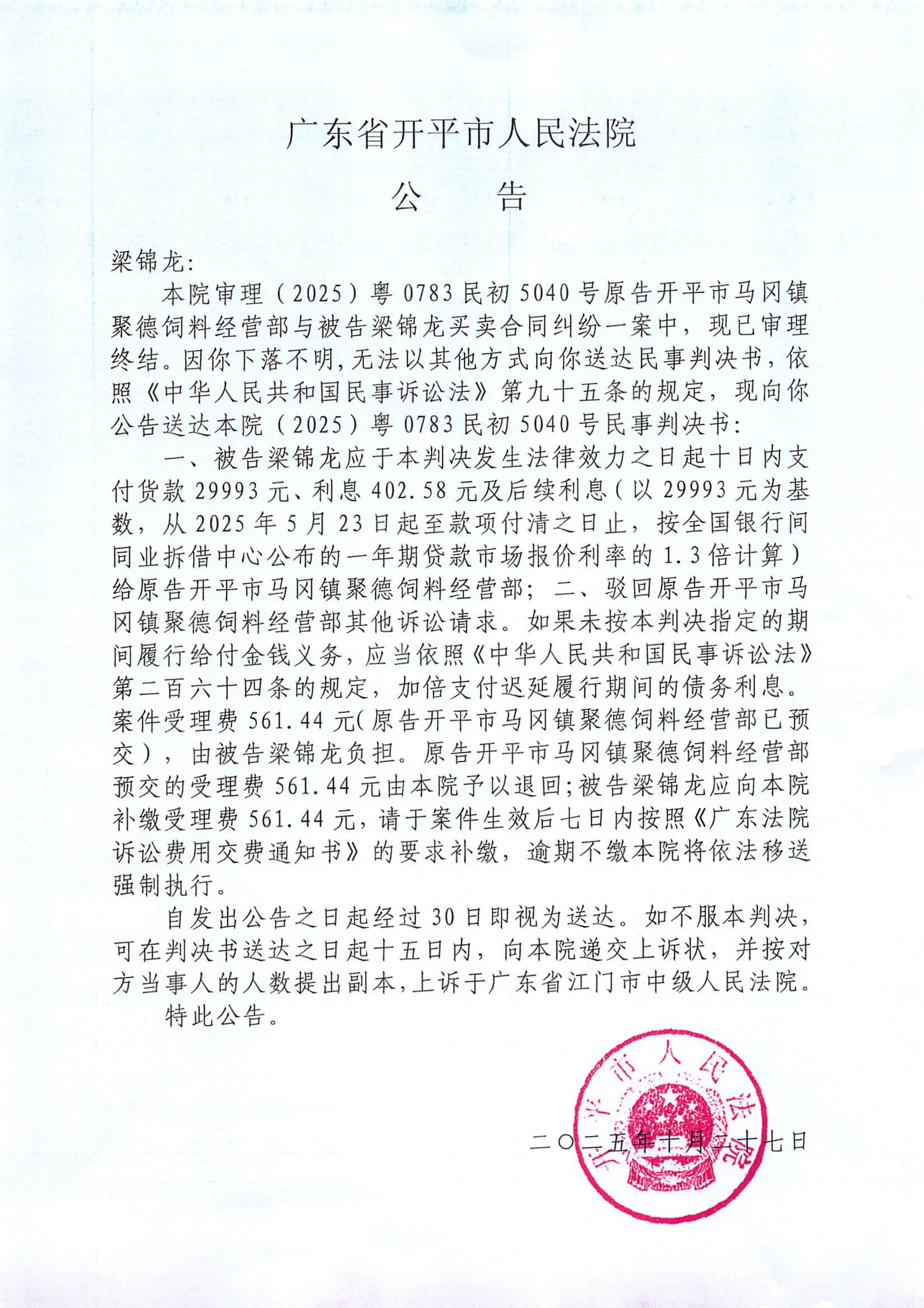 附件:(2025)粤0783民初5040号 梁锦龙 判决公告.pdf