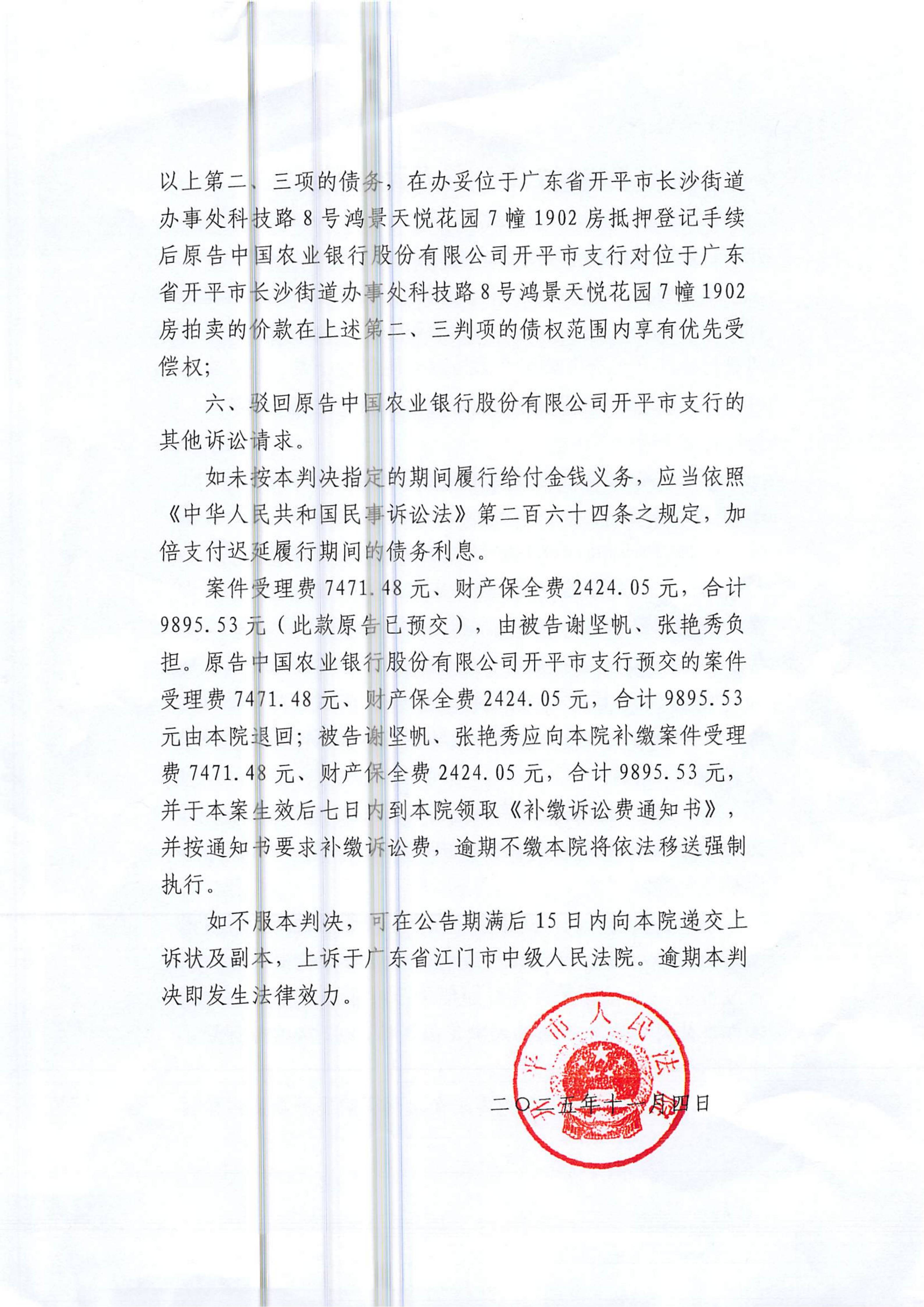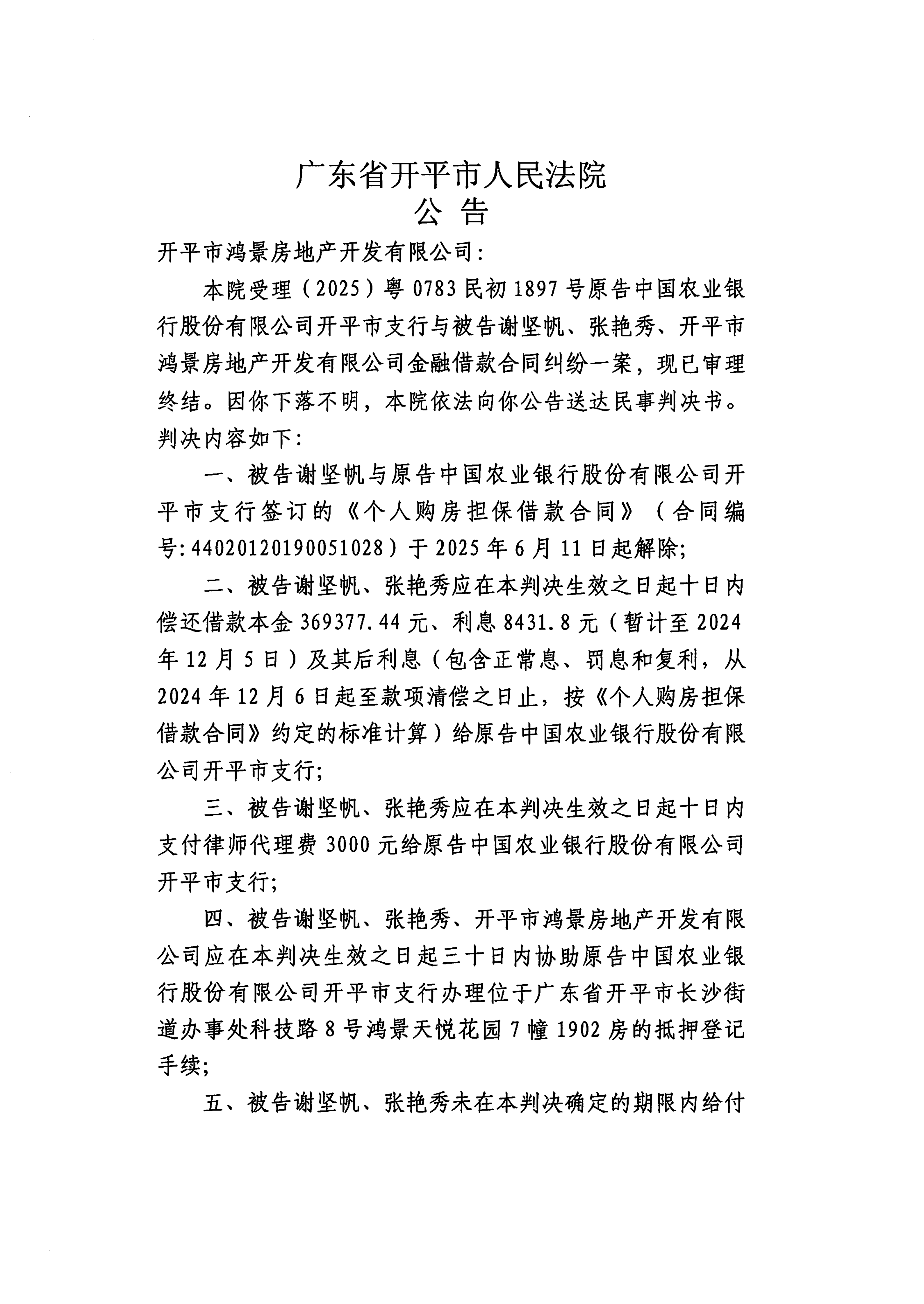 附件:(2025)粤0783民初1897号 开平市鸿景房地产开发有限公司 判决公告.pdf