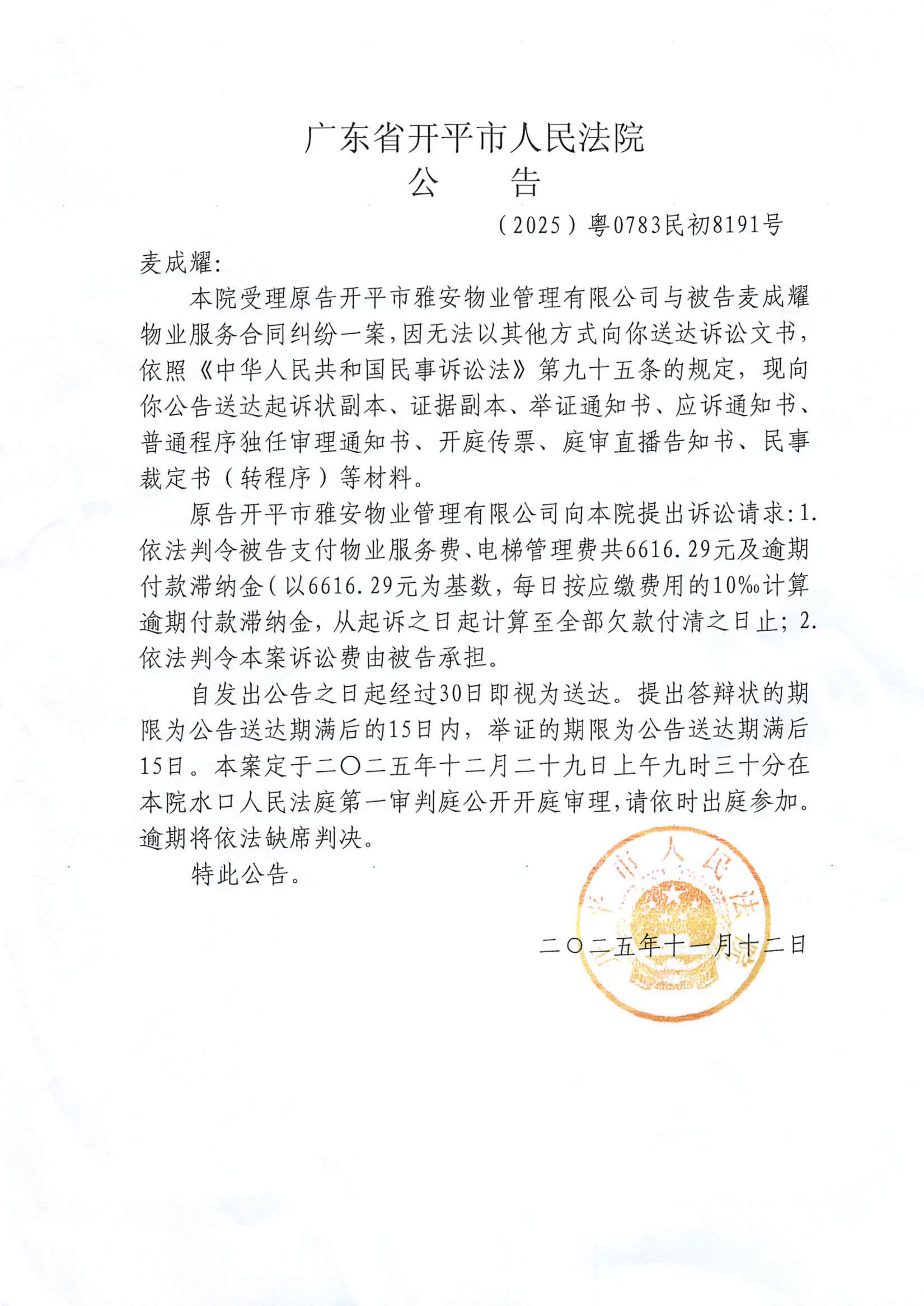 附件:(2025)粤0783民初8191号 麦成耀 开庭公告.pdf