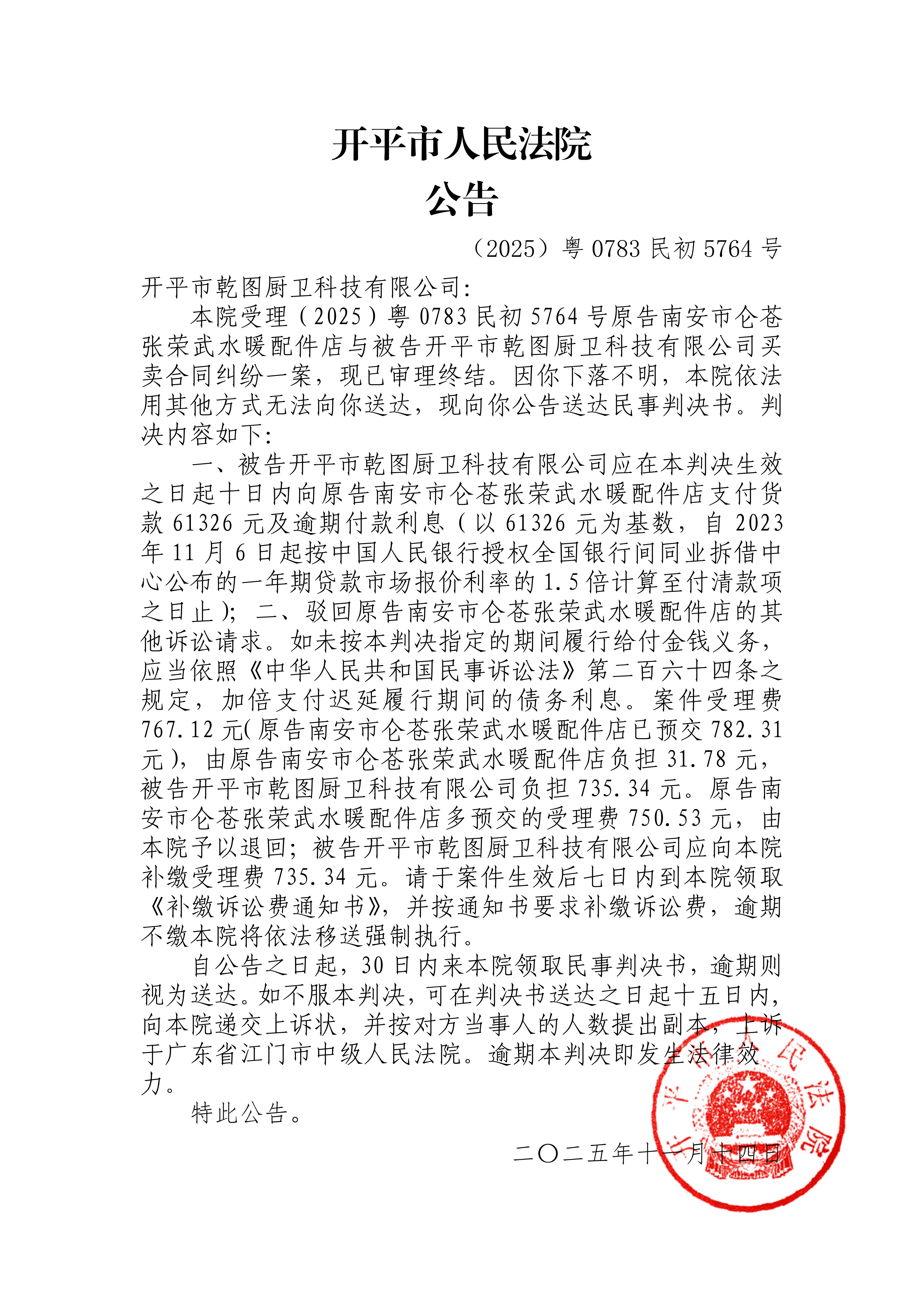 附件:(2025)粤0783民初5764号 开平市乾图厨卫科技有限公司 判决公告.pdf