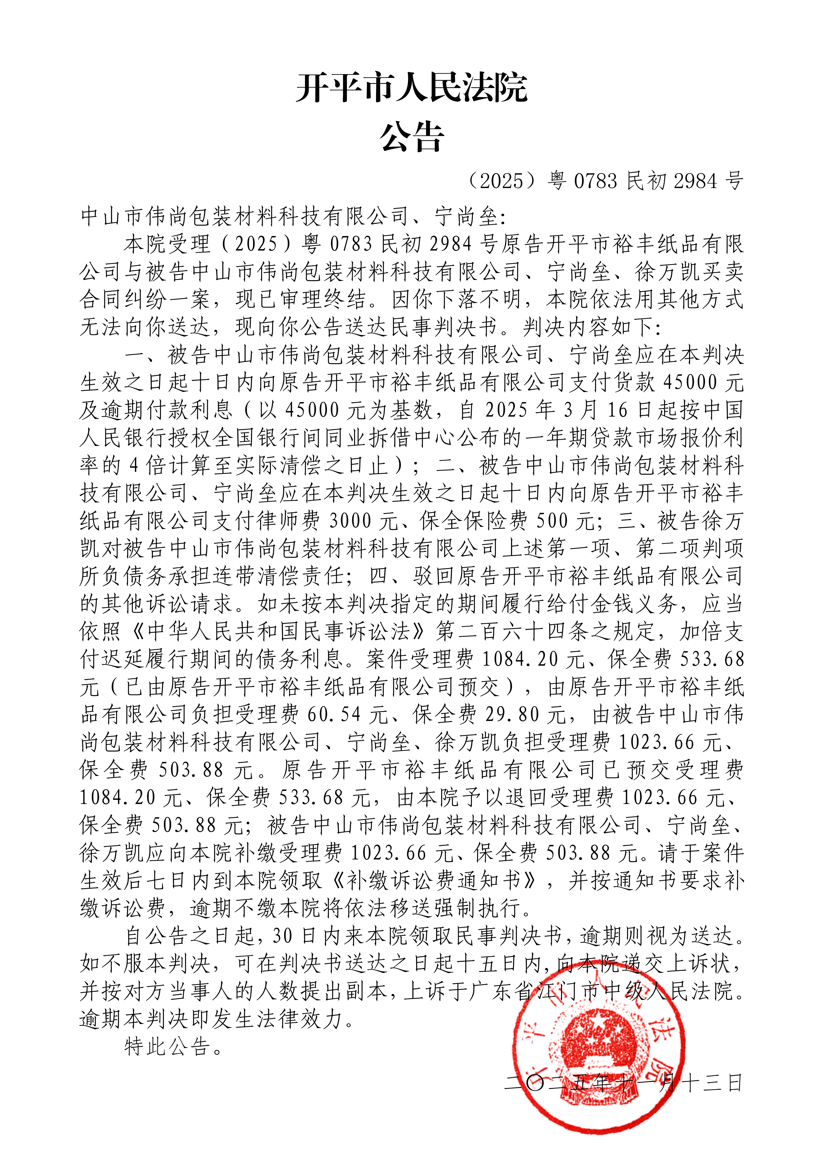 附件:(2025)粤0783民初2984号 中山市伟尚包装材料科技有限公司、宁尚垒 判决公告.pdf