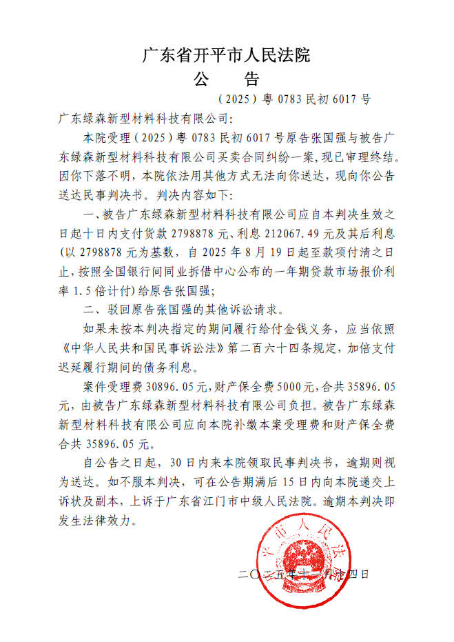 (2025)粤0783民初6017号 广东绿森新型材料科技有限公司 判决公告