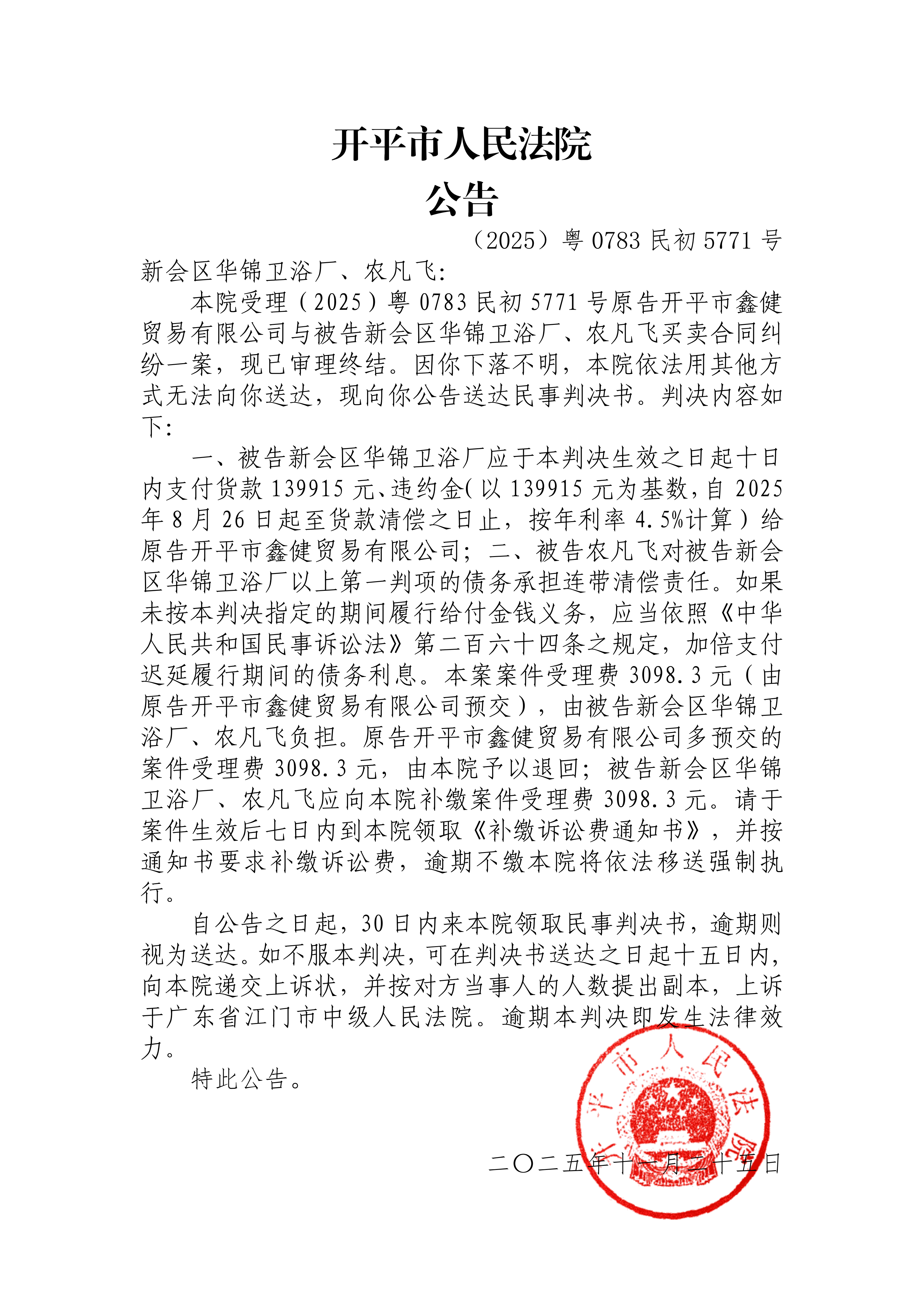 附件:(2025)粤0783民初5771号 新会区华锦卫浴厂、农凡飞 判决公告.pdf