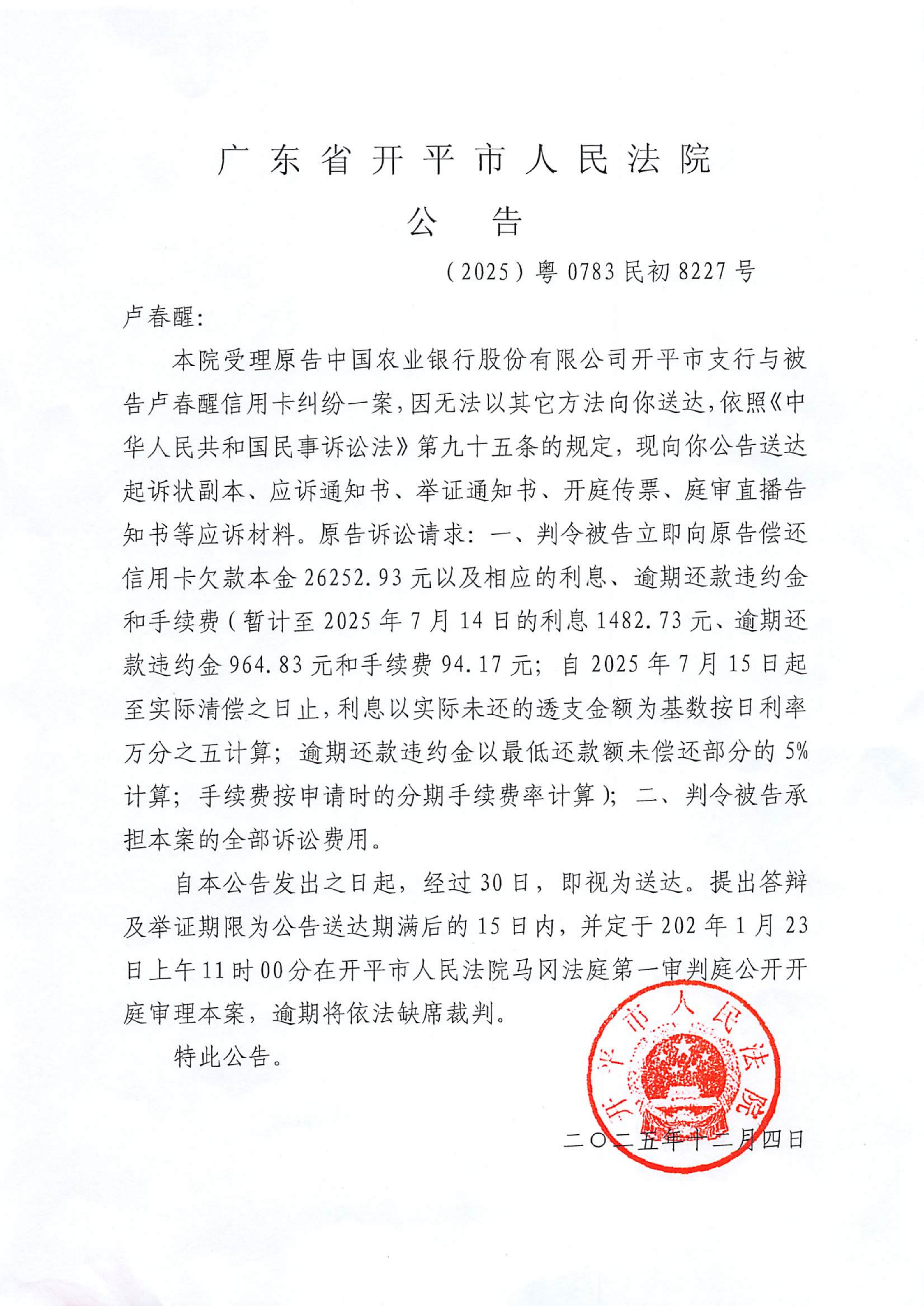 附件:(2025)粤0783民初8227号 卢春醒 开庭公告.pdf