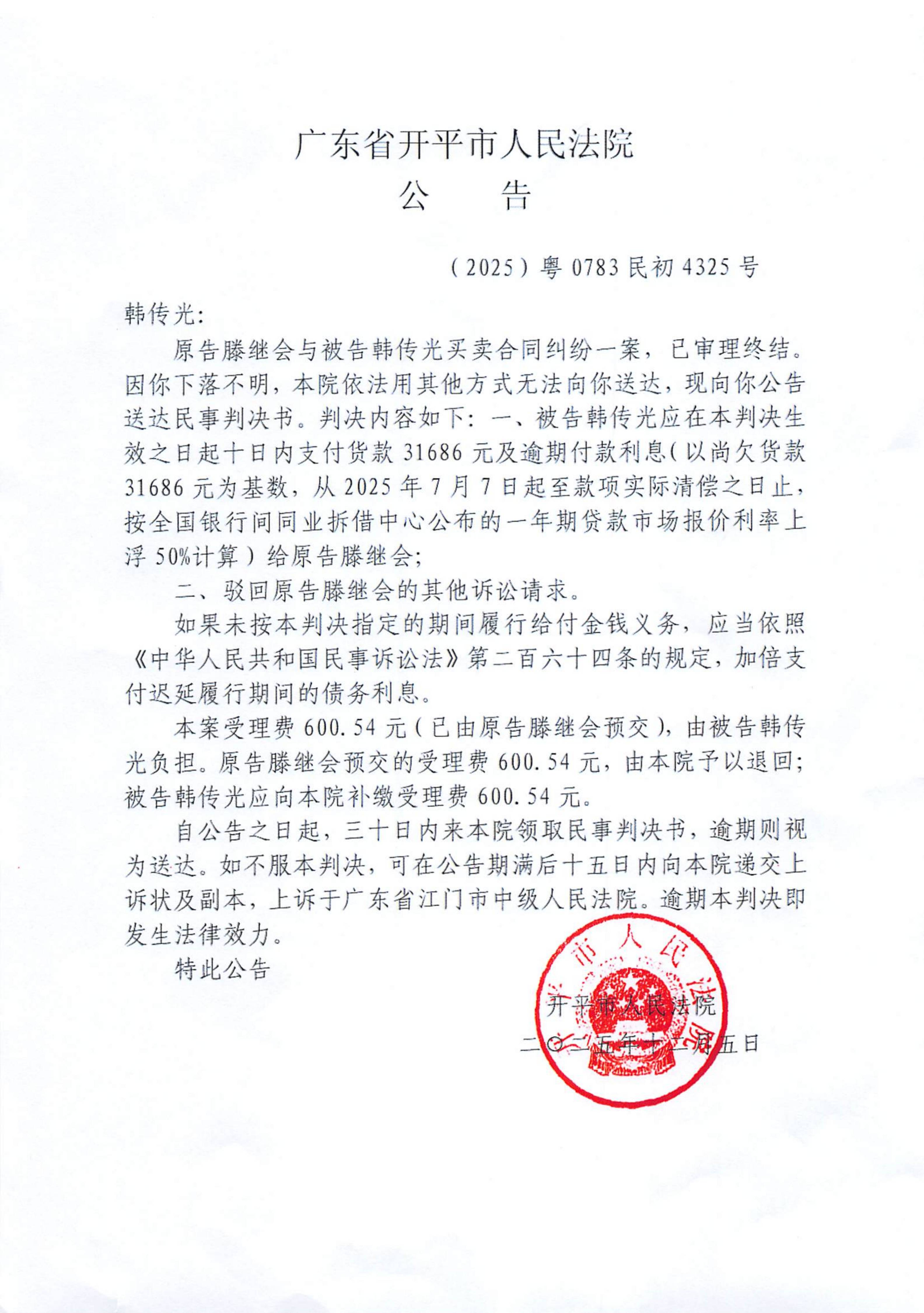 附件:(2025)粤0783民初4325号 韩传光 判决公告.pdf