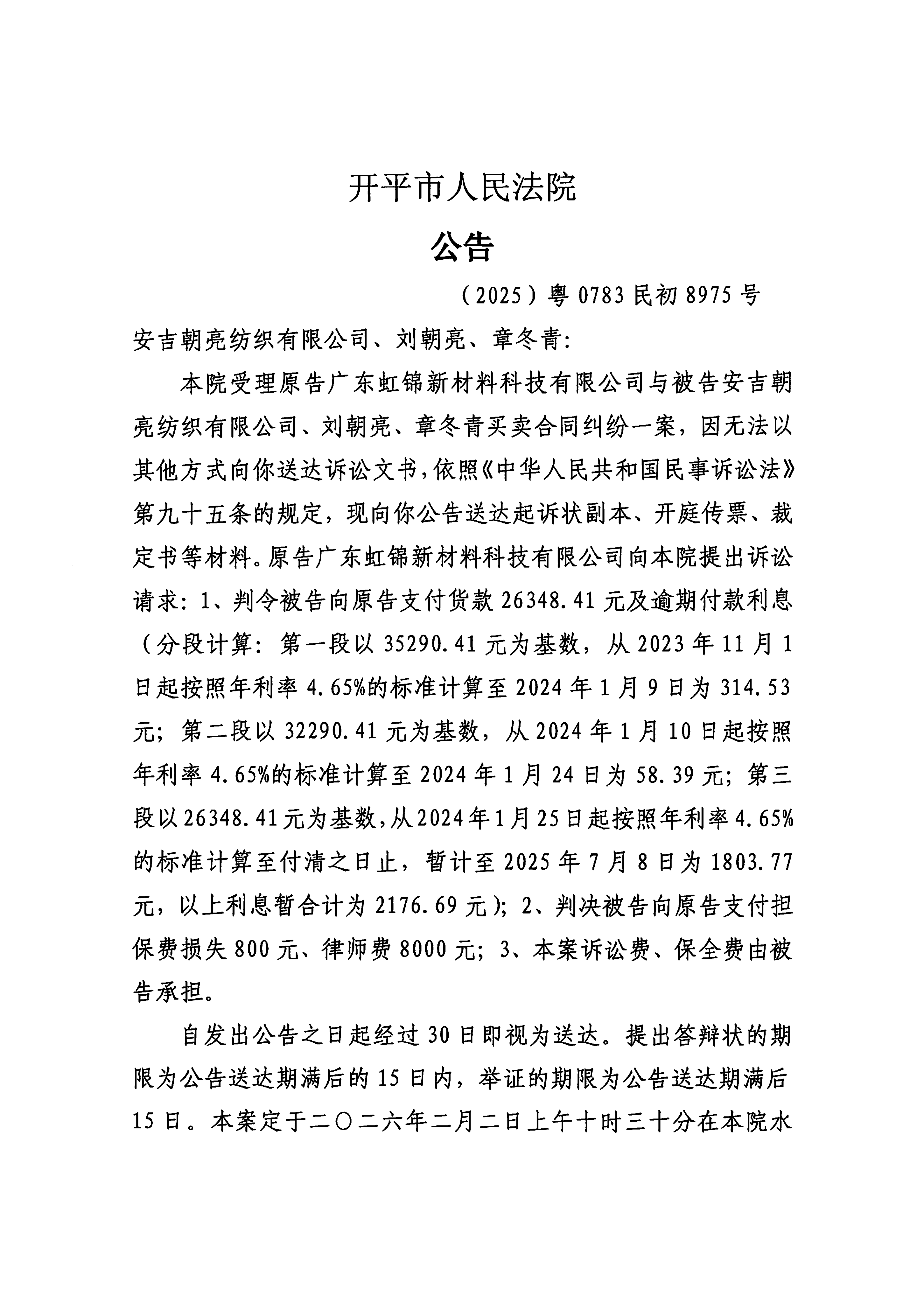 附件:(2025)粤0783民初8975号 安吉朝亮纺织有限公司、刘朝亮、章冬青 开庭公告.pdf