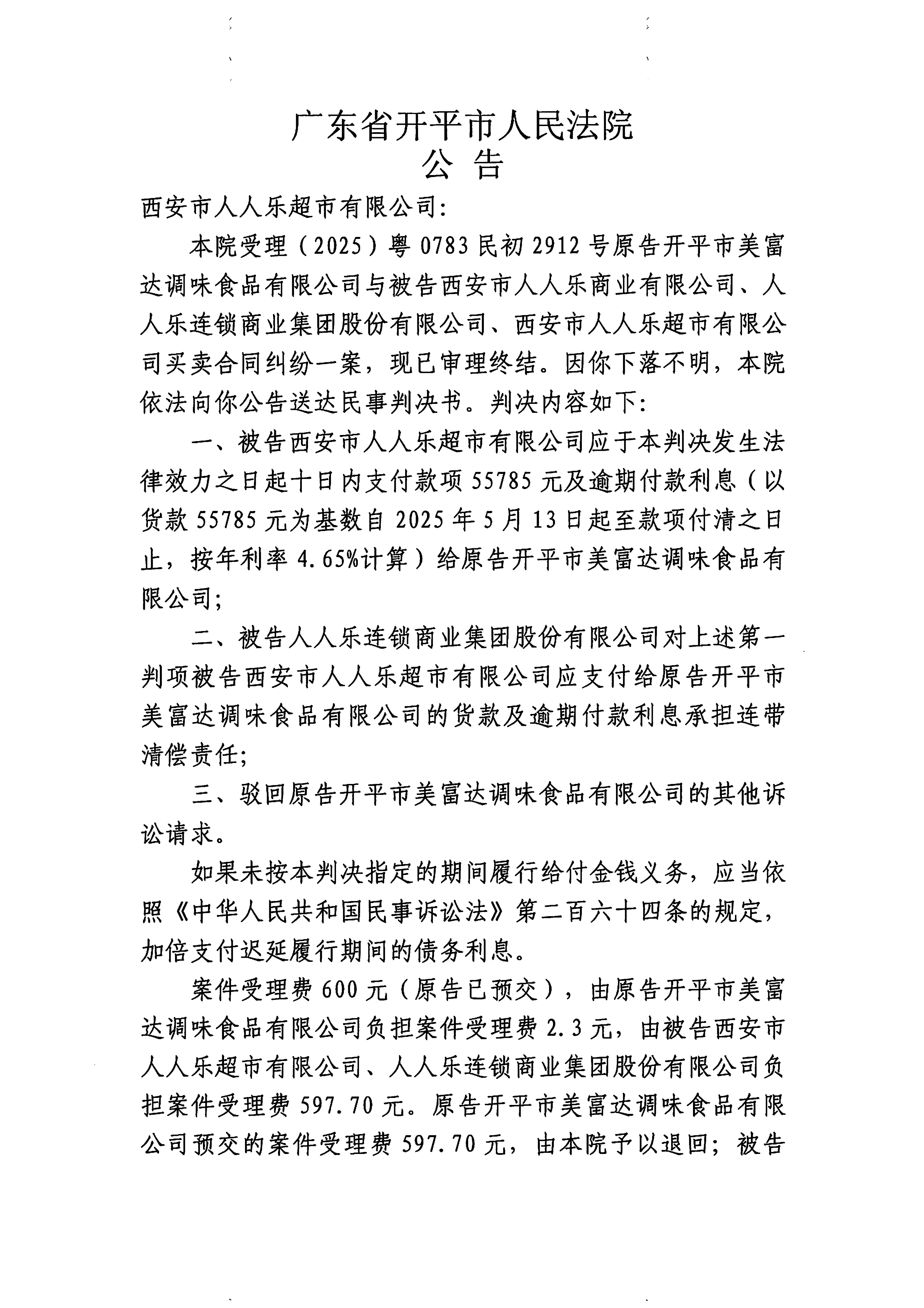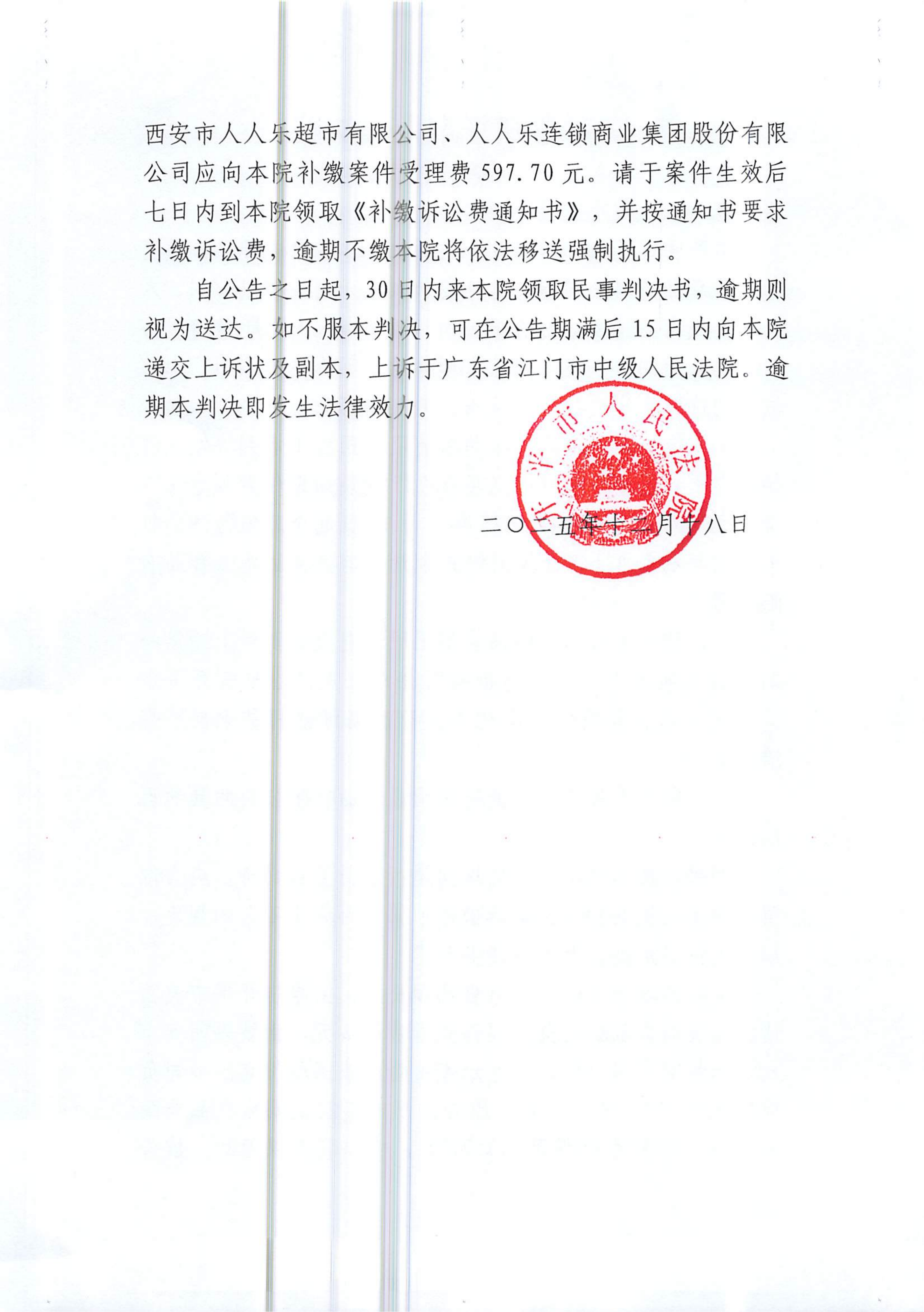 附件:(2025)粤0783民初2912号 西安市人人乐超市有限公司 判决公告.pdf