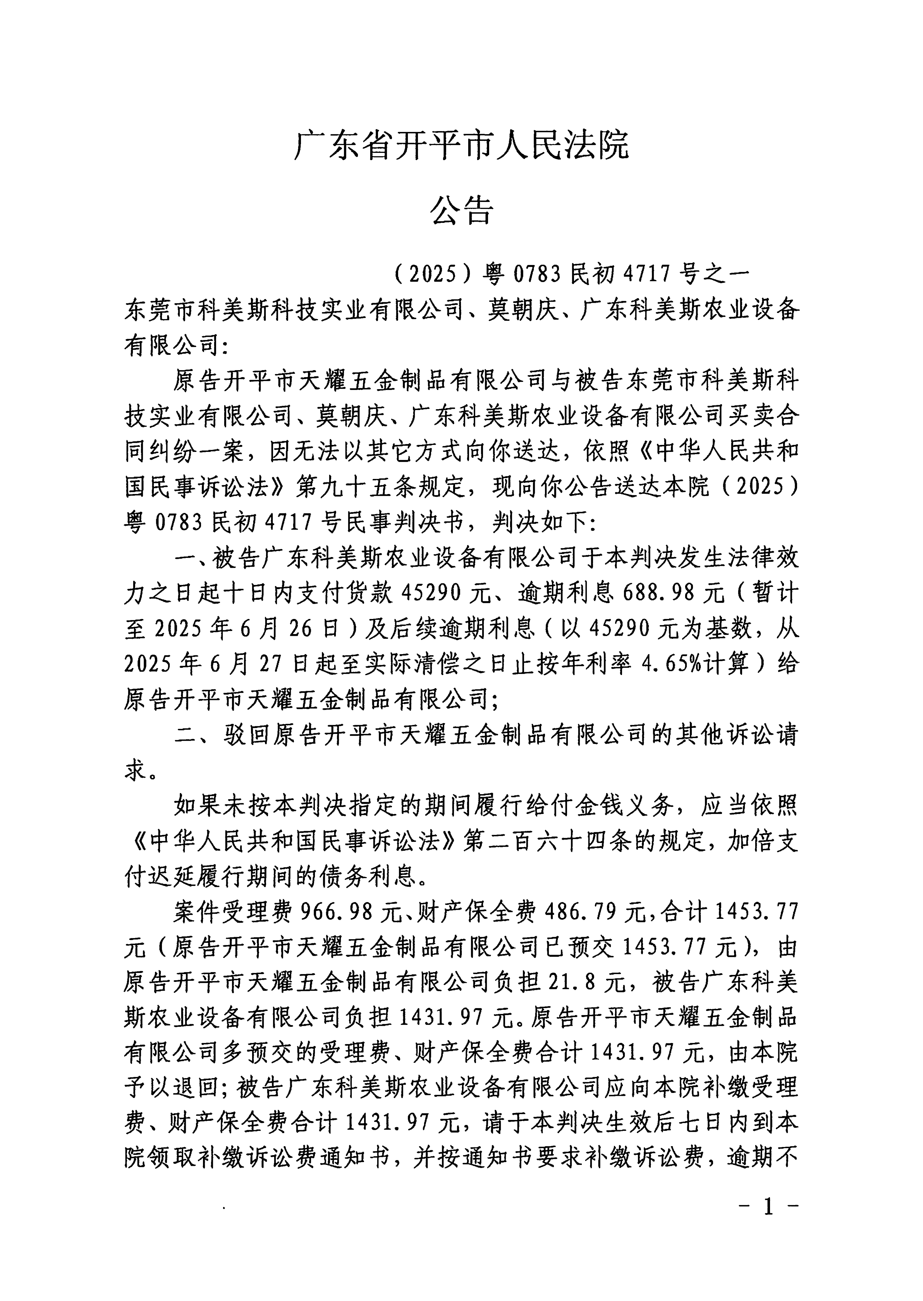 附件:(2025)粤0783民初4717号之一 东莞市科美斯科技实业有限公司、莫朝庆、广东科美斯农业设备有限公司 判决公告.pdf