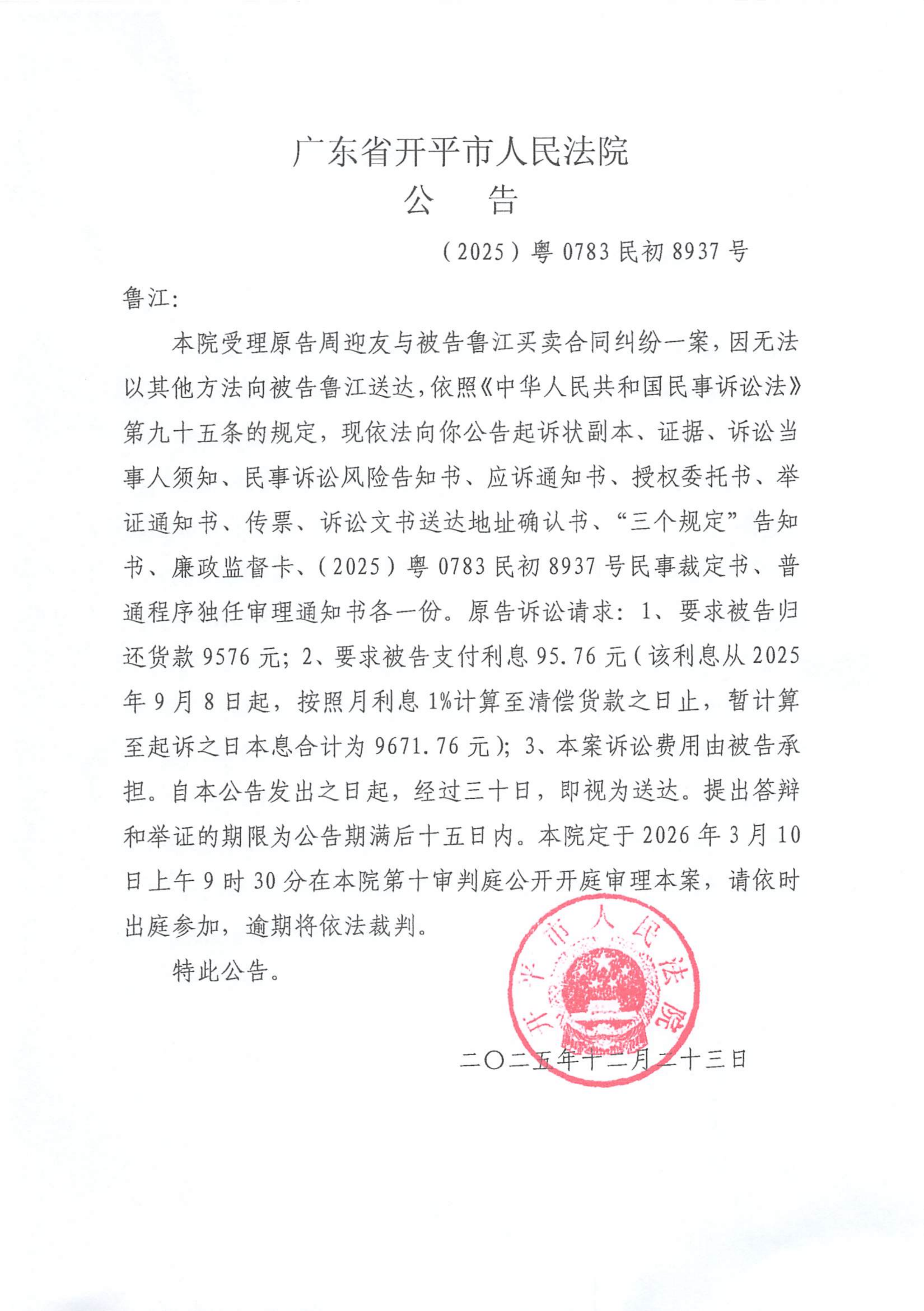 附件:(2025)粤0783民初8937号 鲁江 开庭公告.pdf