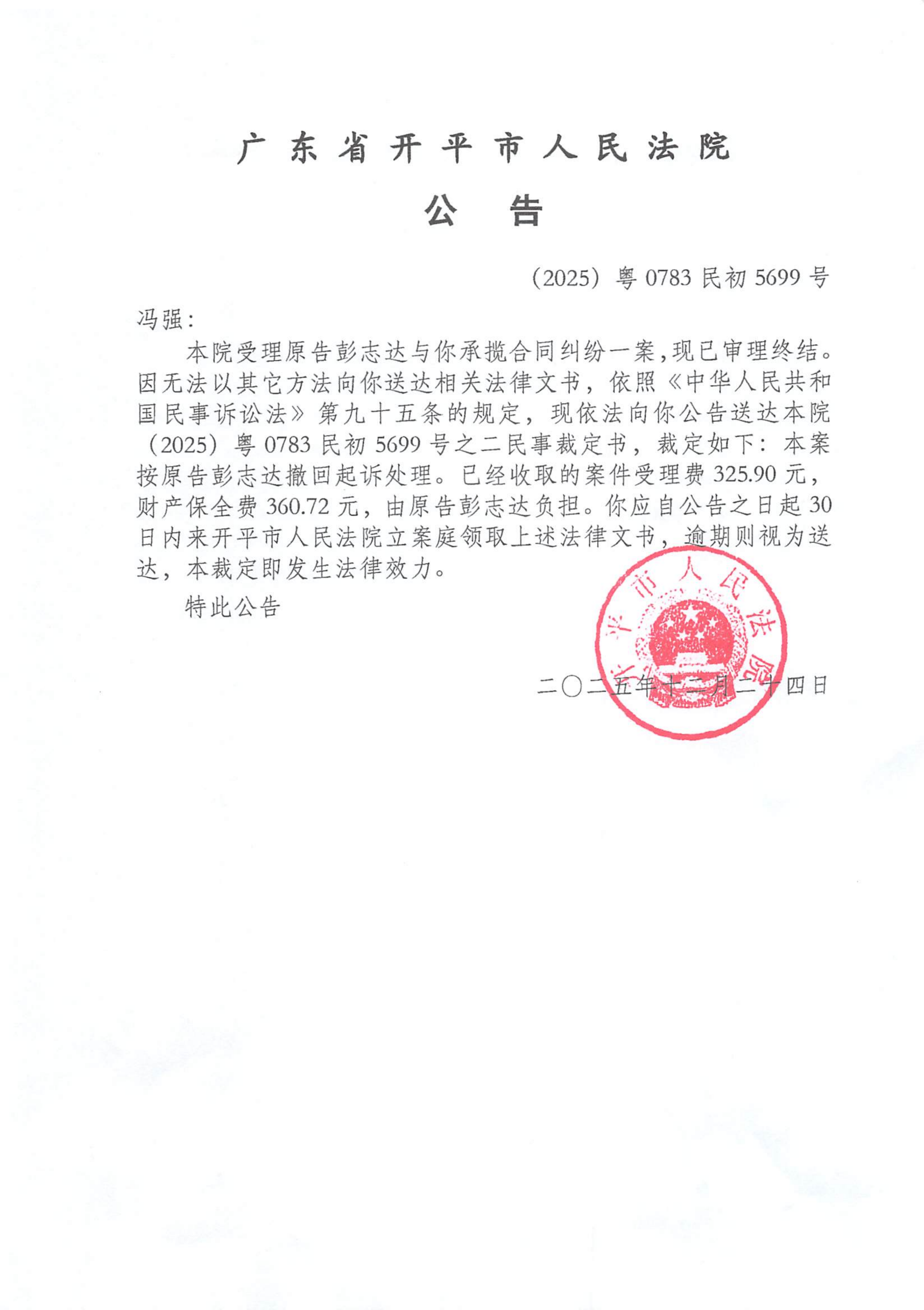 附件:(2025)粤0783民初5699号 冯强 裁定公告.pdf