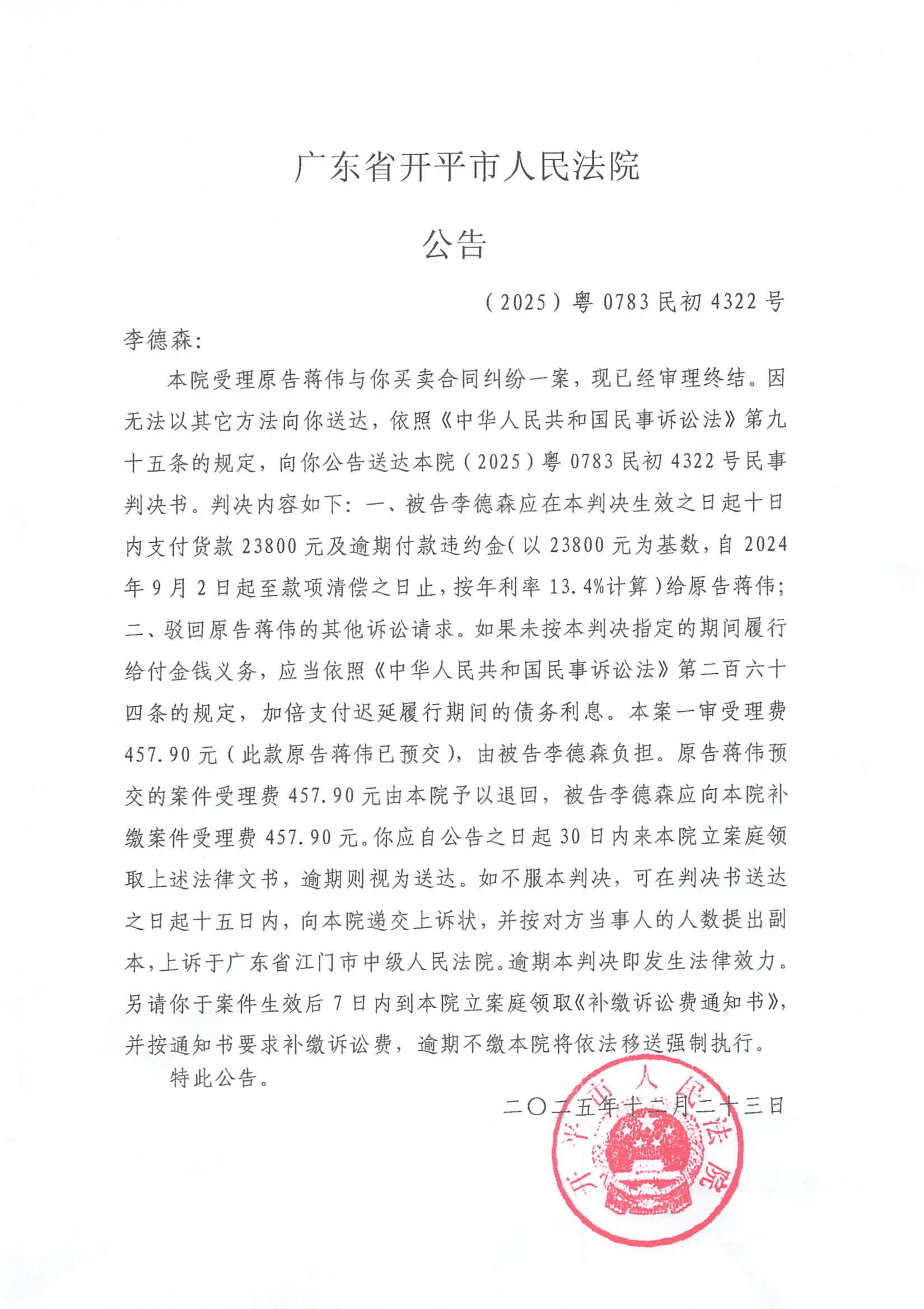 附件:(2025)粤0783民初4322号 李德森 判决公告.pdf