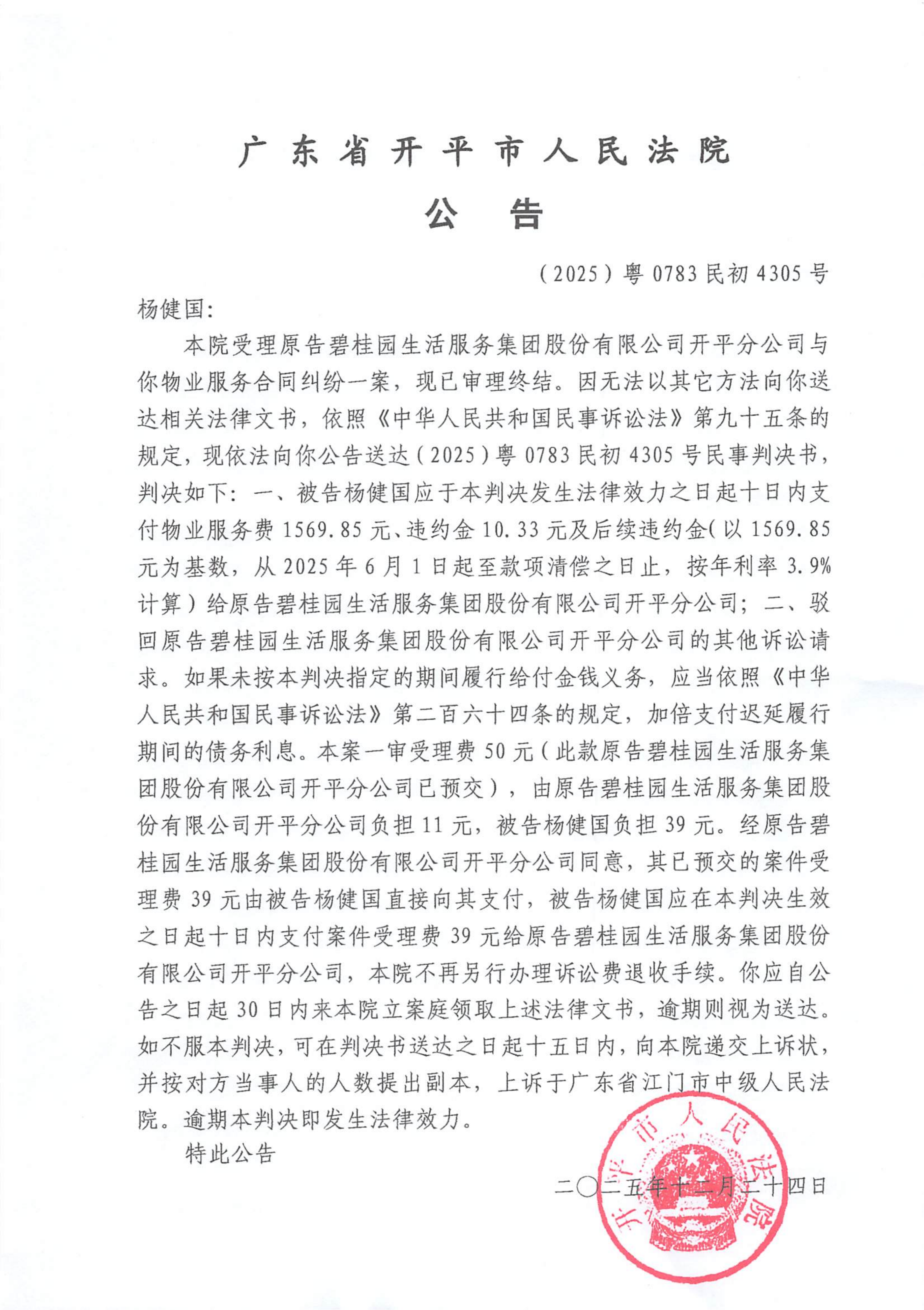 附件:(2025)粤0783民初4305号 杨健国 判决公告.pdf