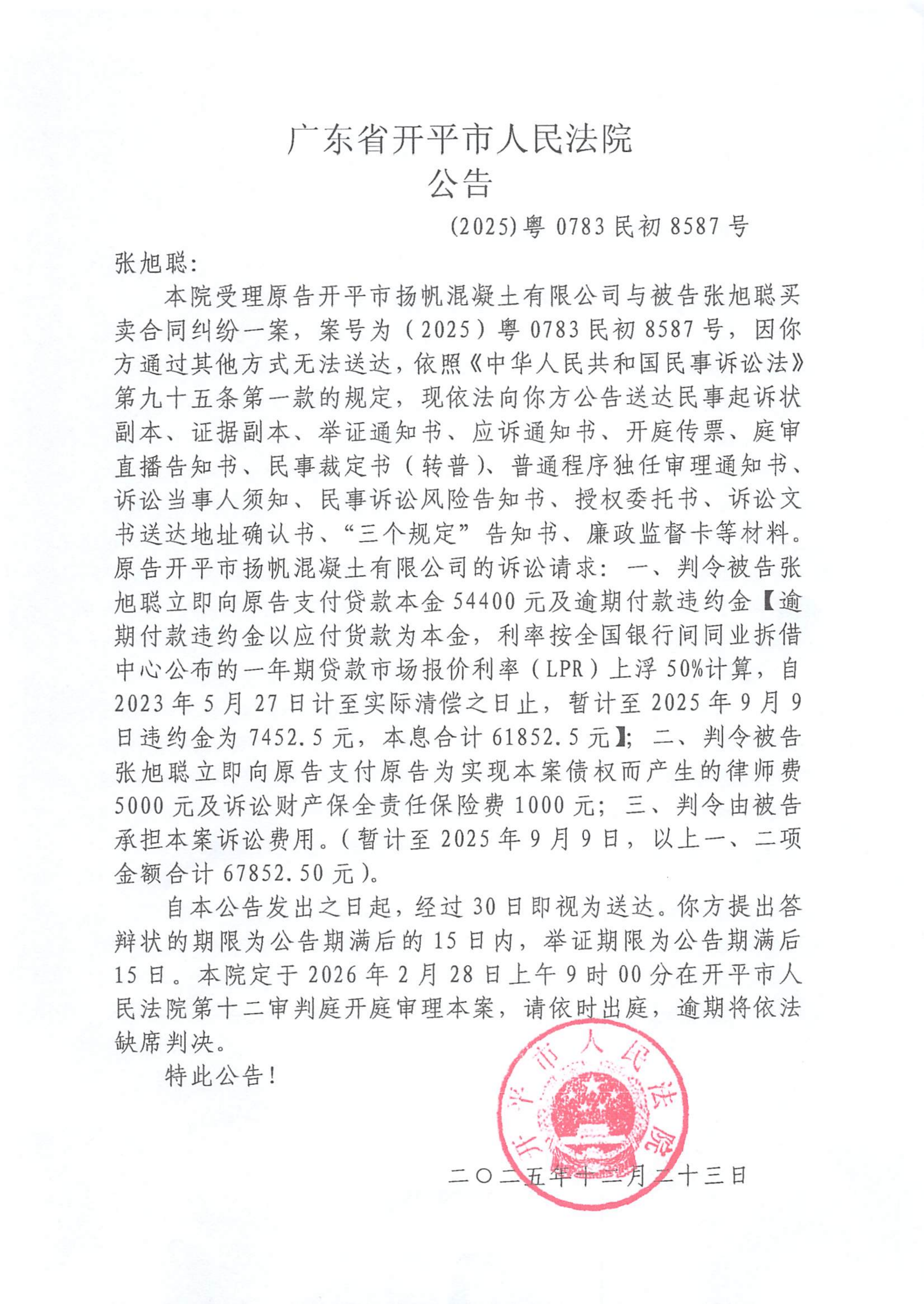 附件:(2025)粤0783民初8587号 张旭聪 开庭公告.pdf