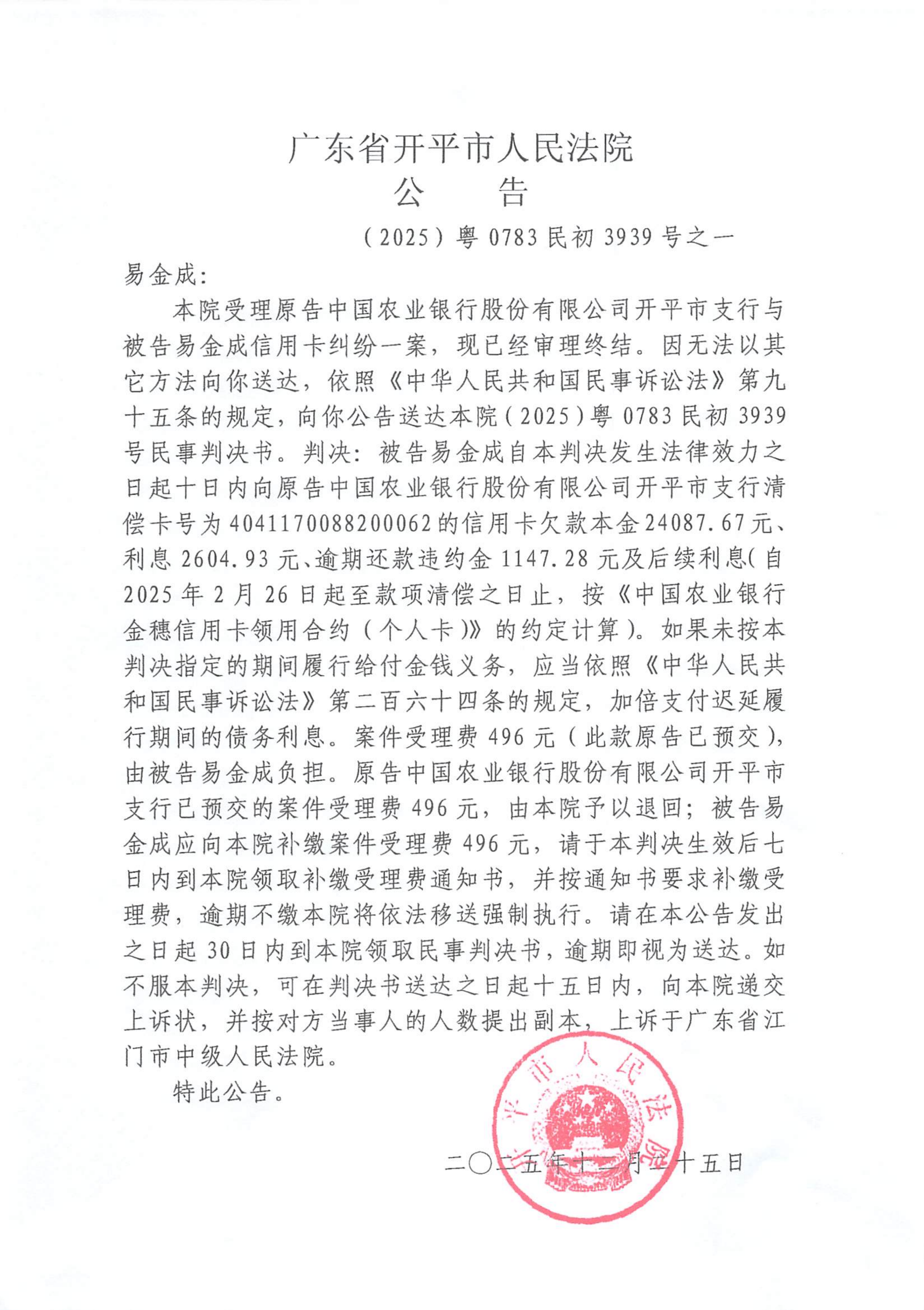 附件:(2025)粤0783民初3939号之一 易金成 判决公告.pdf