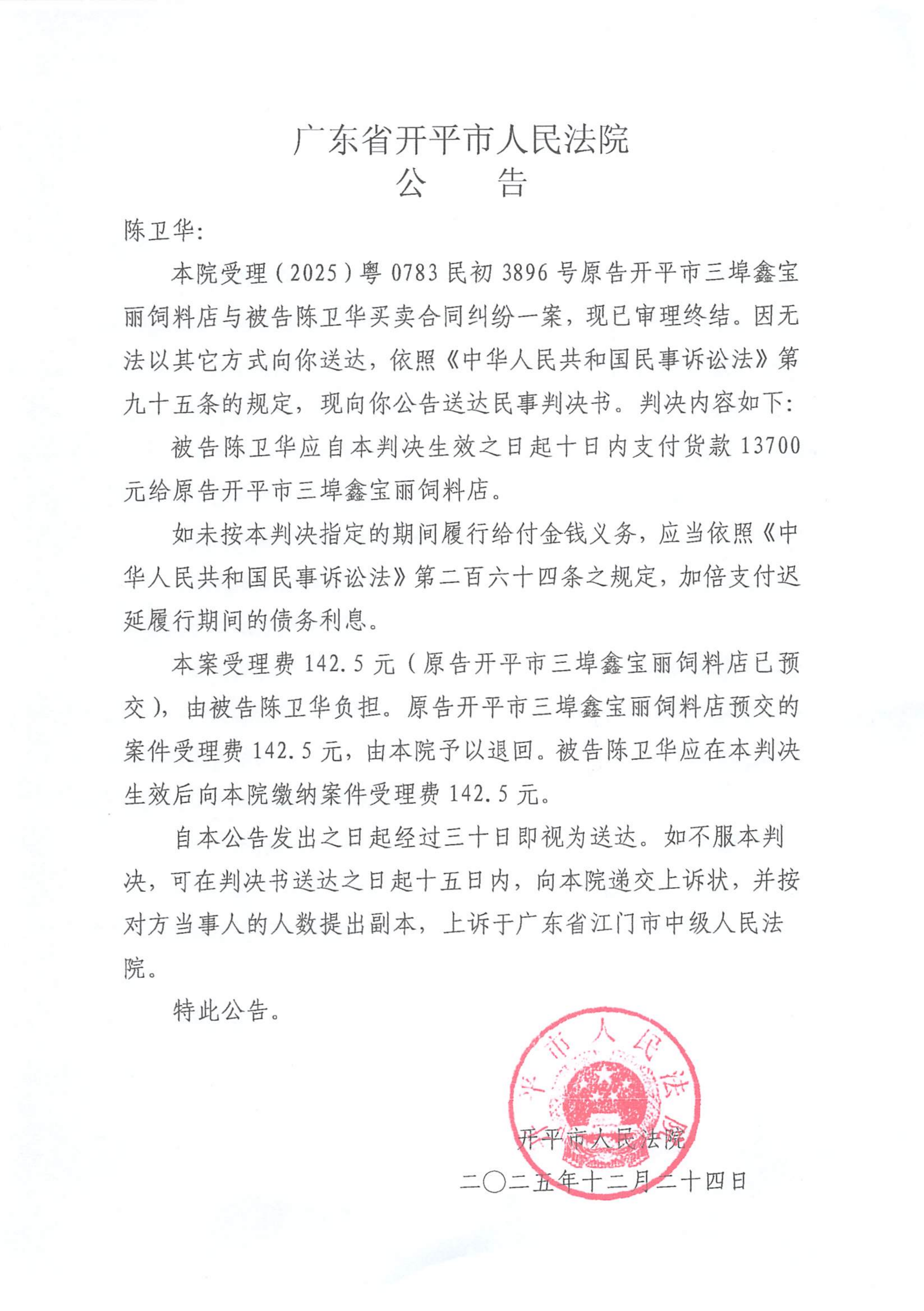 附件:(2025)粤0783民初3896号 陈卫华 判决公告.pdf