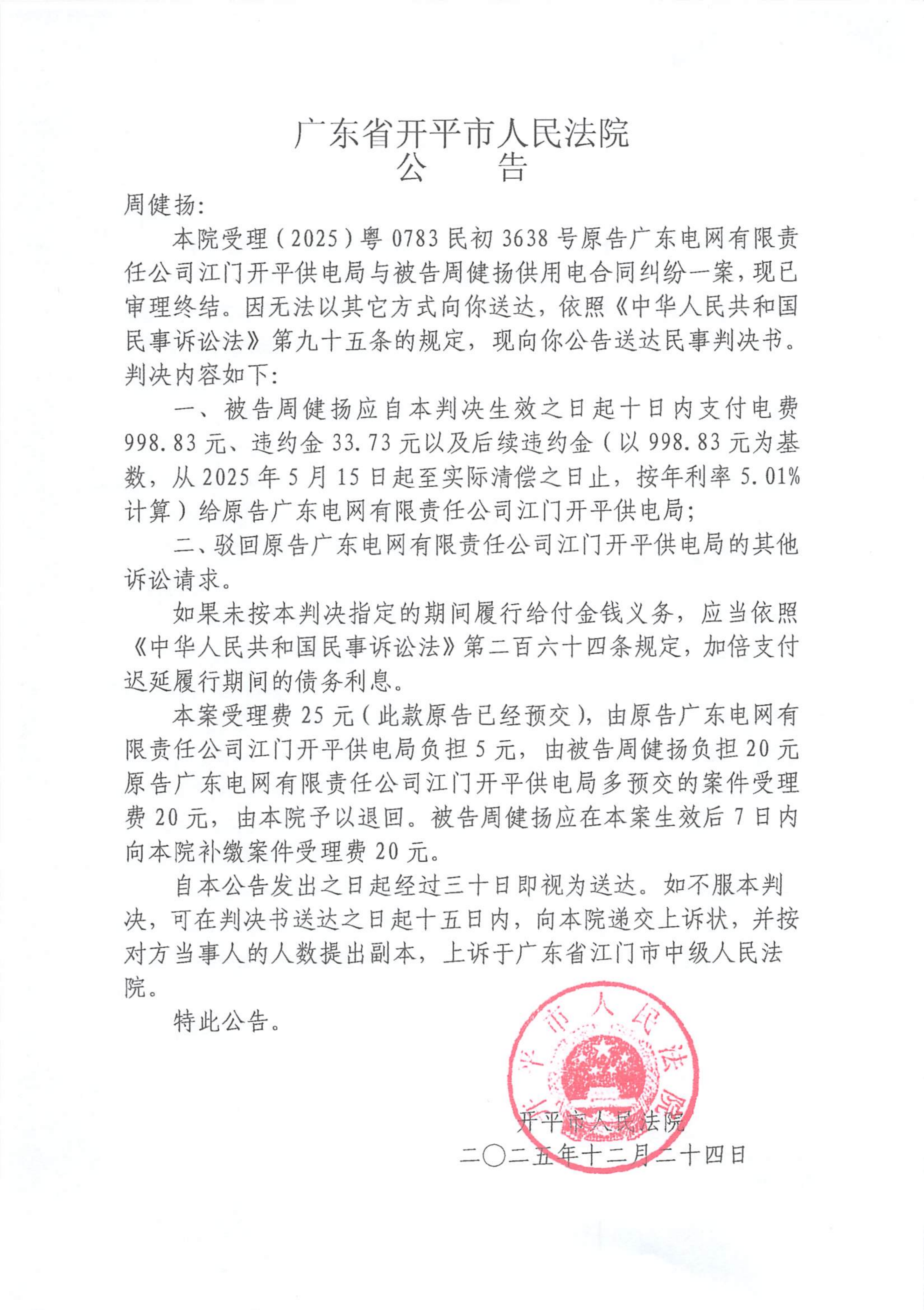 附件:(2025)粤0783民初3638号 周健扬 判决公告.pdf