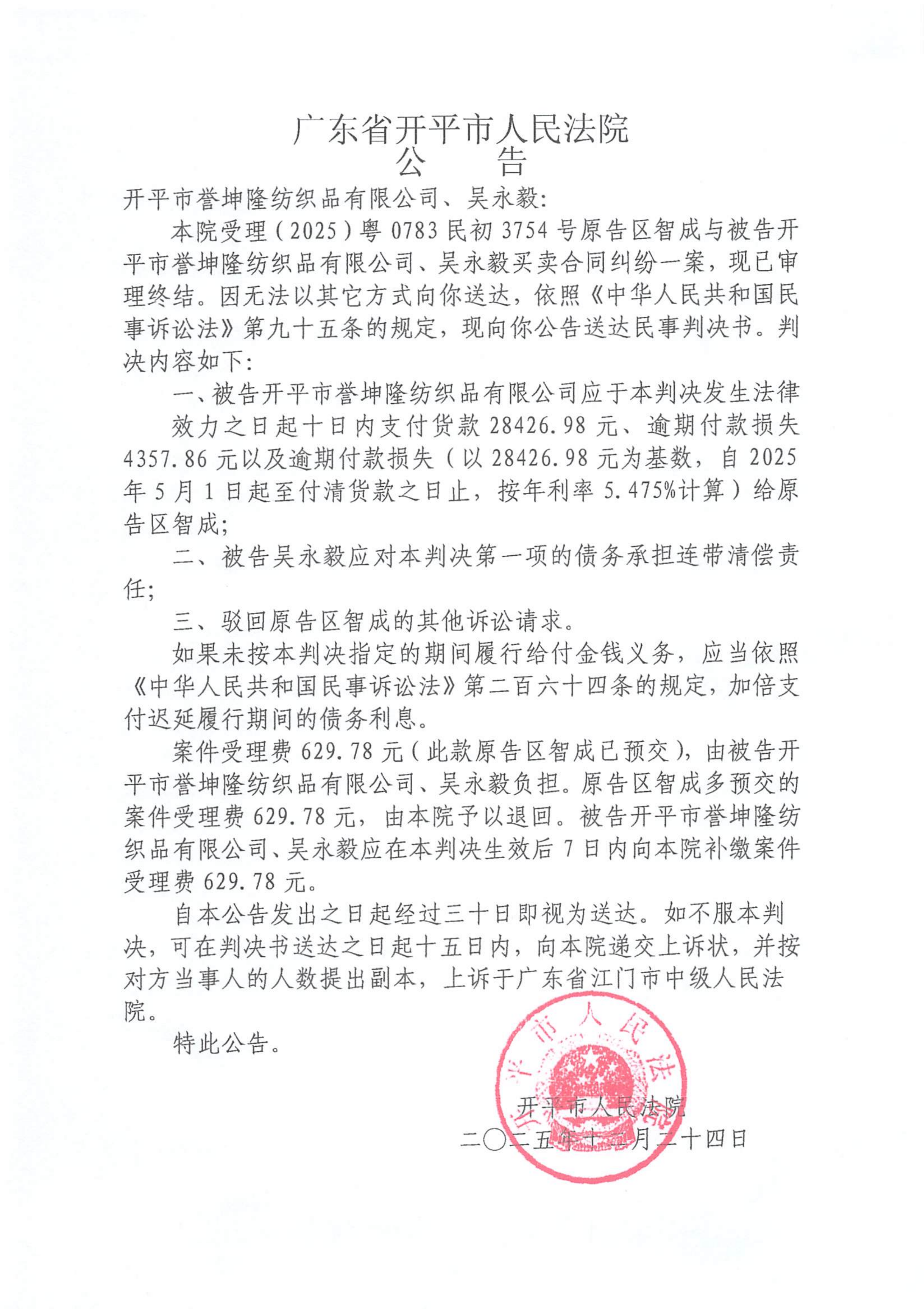 附件:(2025)粤0783民初3754号 开平市誉坤隆纺织品有限公司、吴永毅 判决公告.pdf
