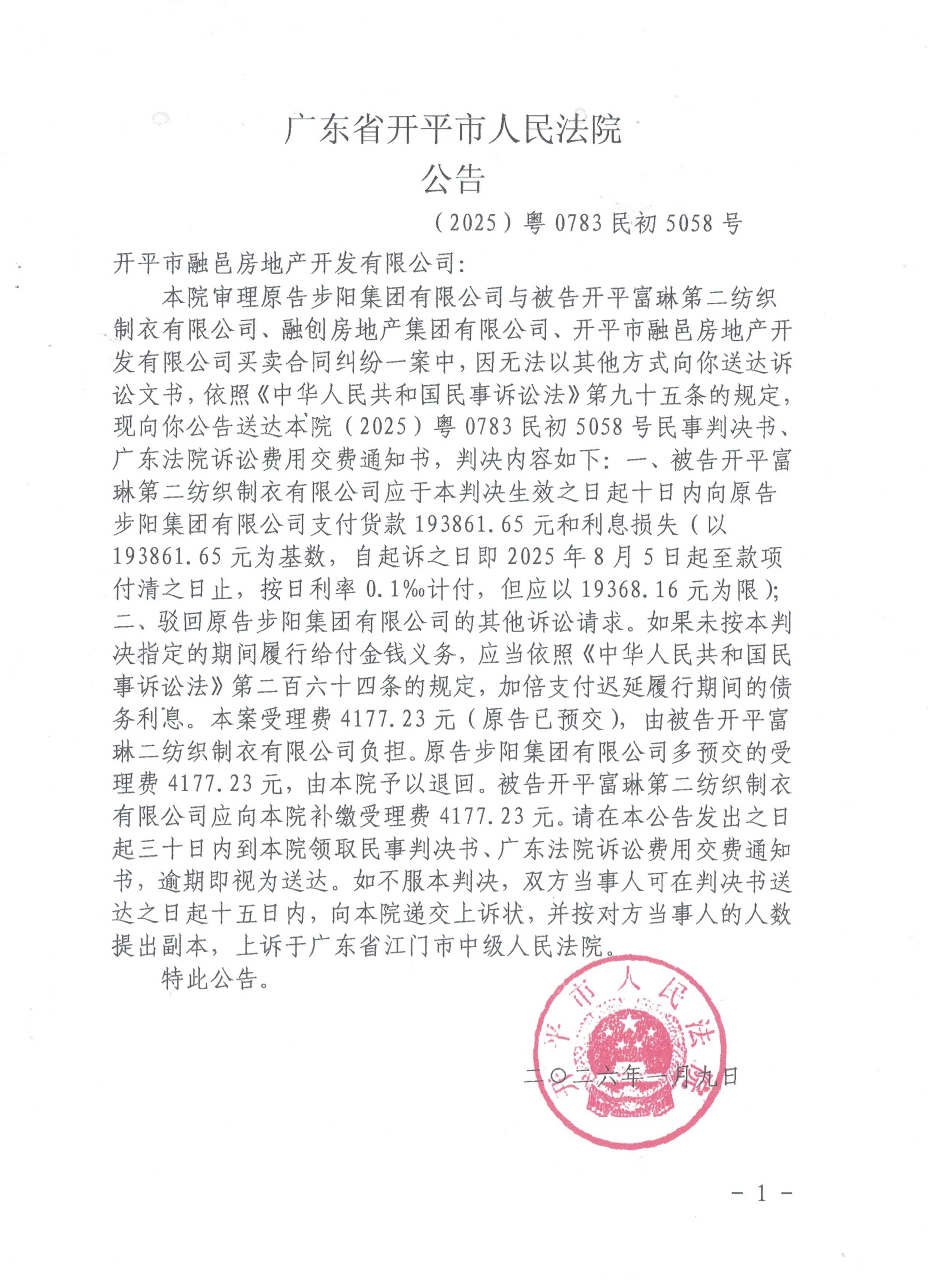 (2025)粤0783民初5058号 开平市融邑房地产开发有限公司 判决公告