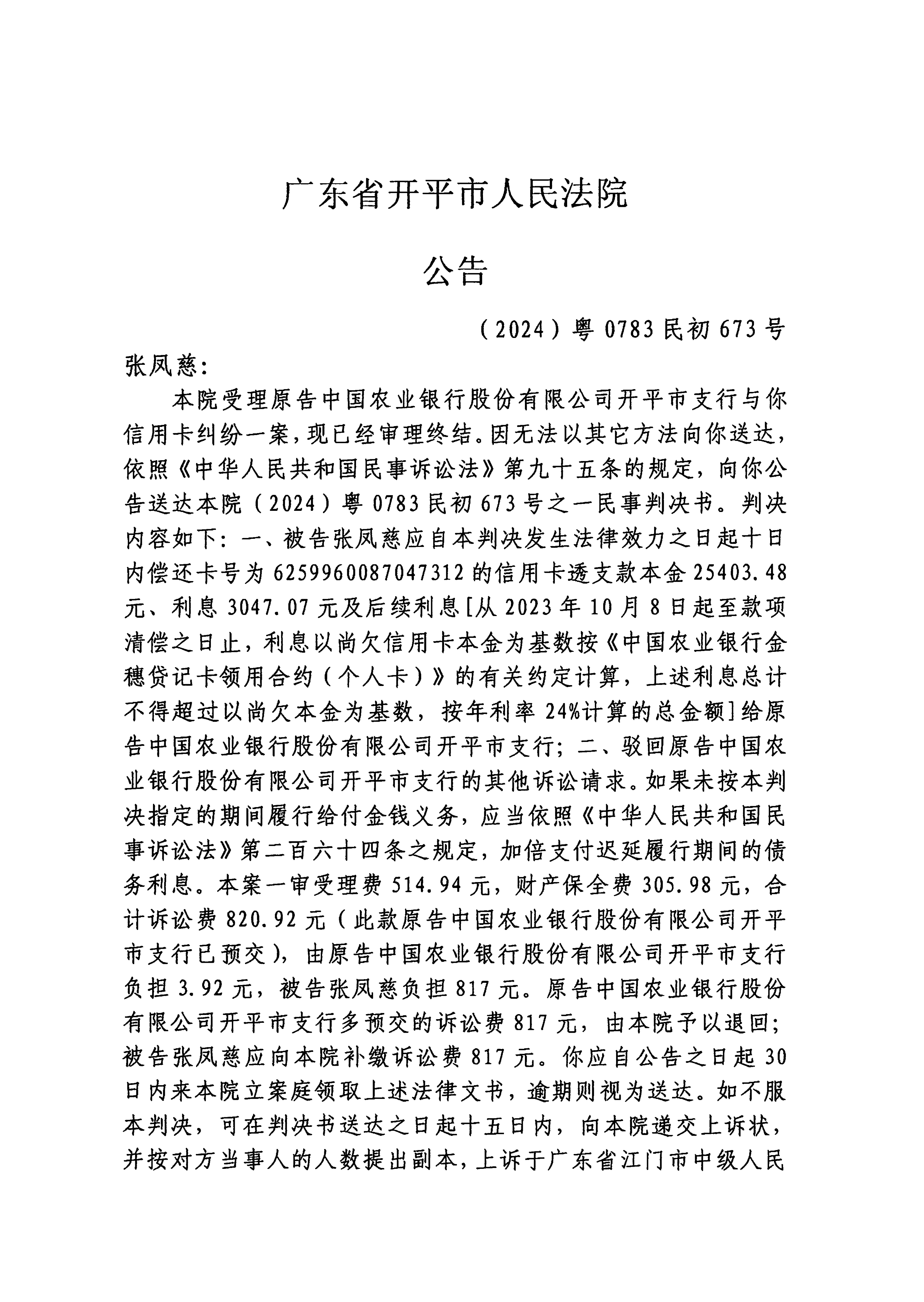 附件:(2024)粤0783民初673号 张凤慈 判决公告.pdf