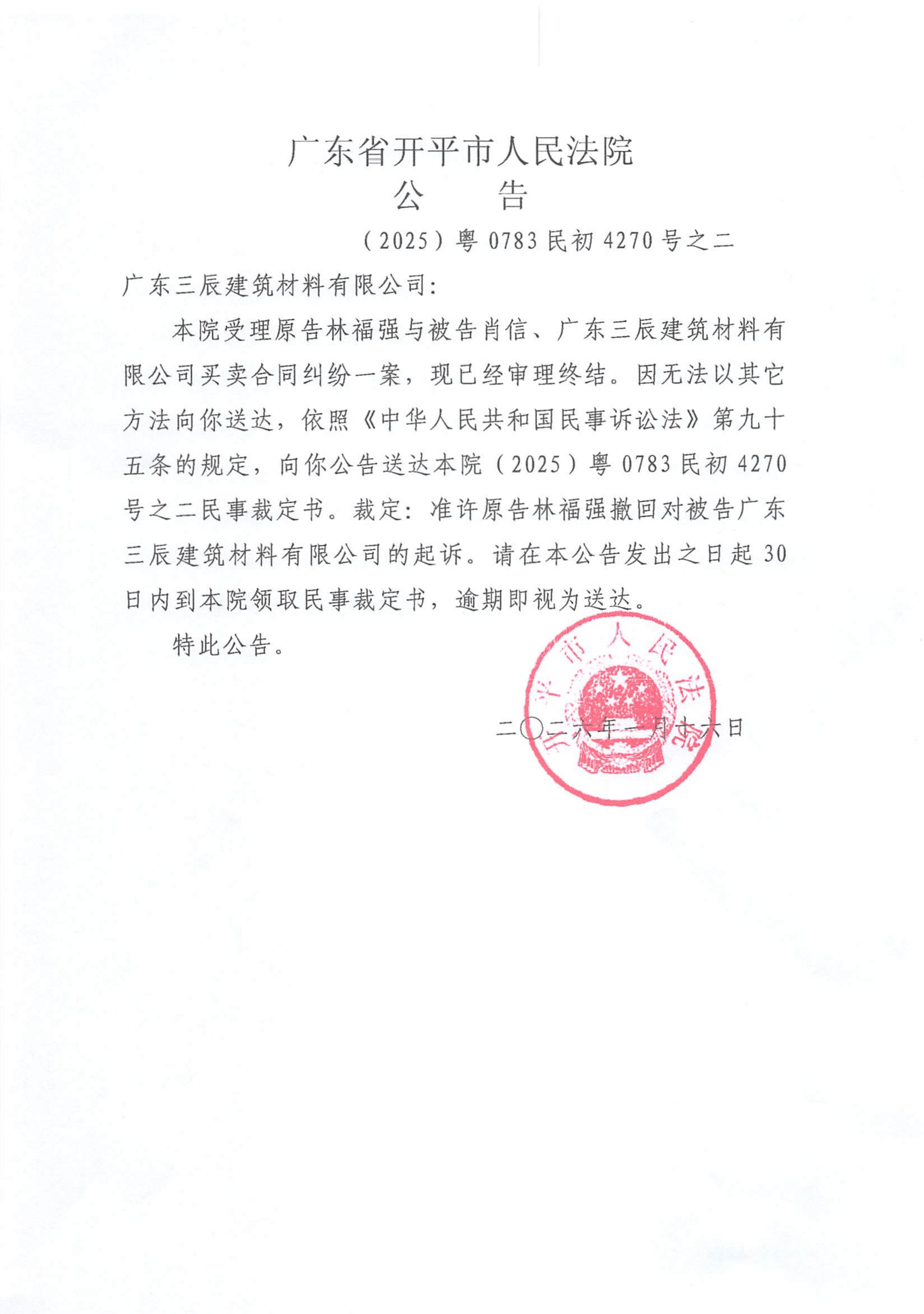 附件:(2025)粤0783民初4270号之二 广东三辰建筑材料有限公司 裁定公告.pdf