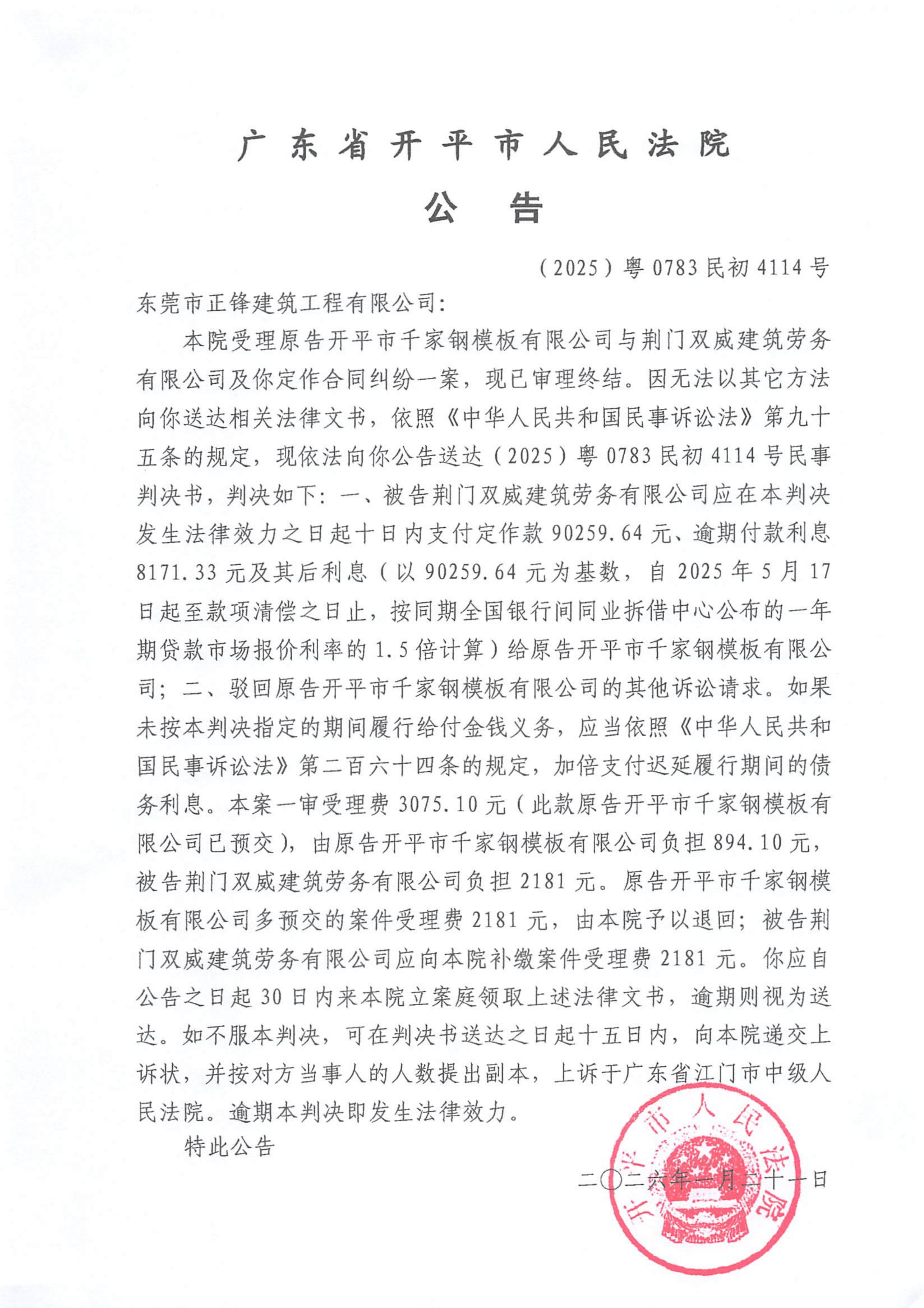 附件:(2025)粤0783民初4114号 东莞市正锋建筑工程有限公司 判决公告.pdf