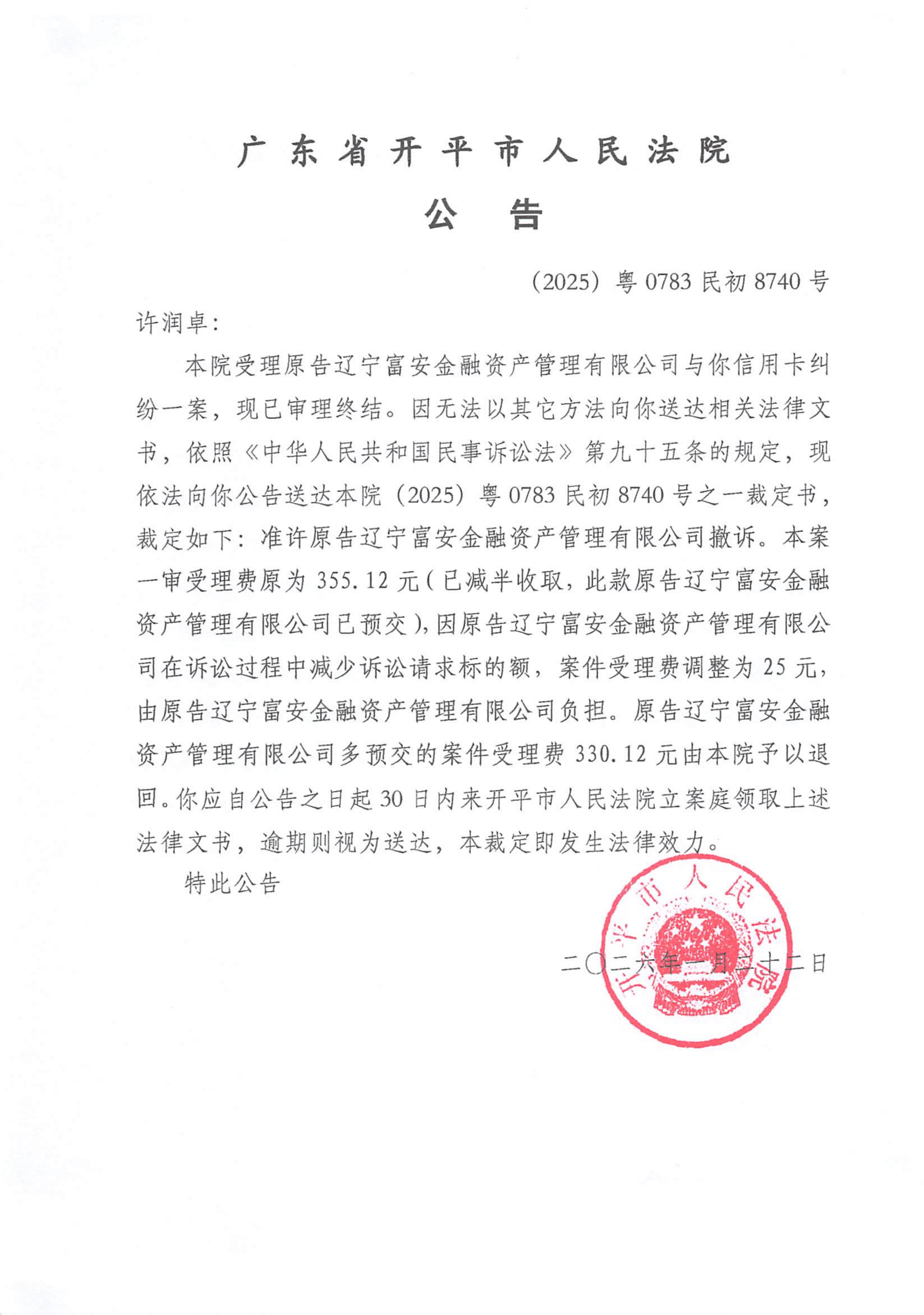 附件:(2025)粤0783民初8740号 许润卓 裁定公告.pdf