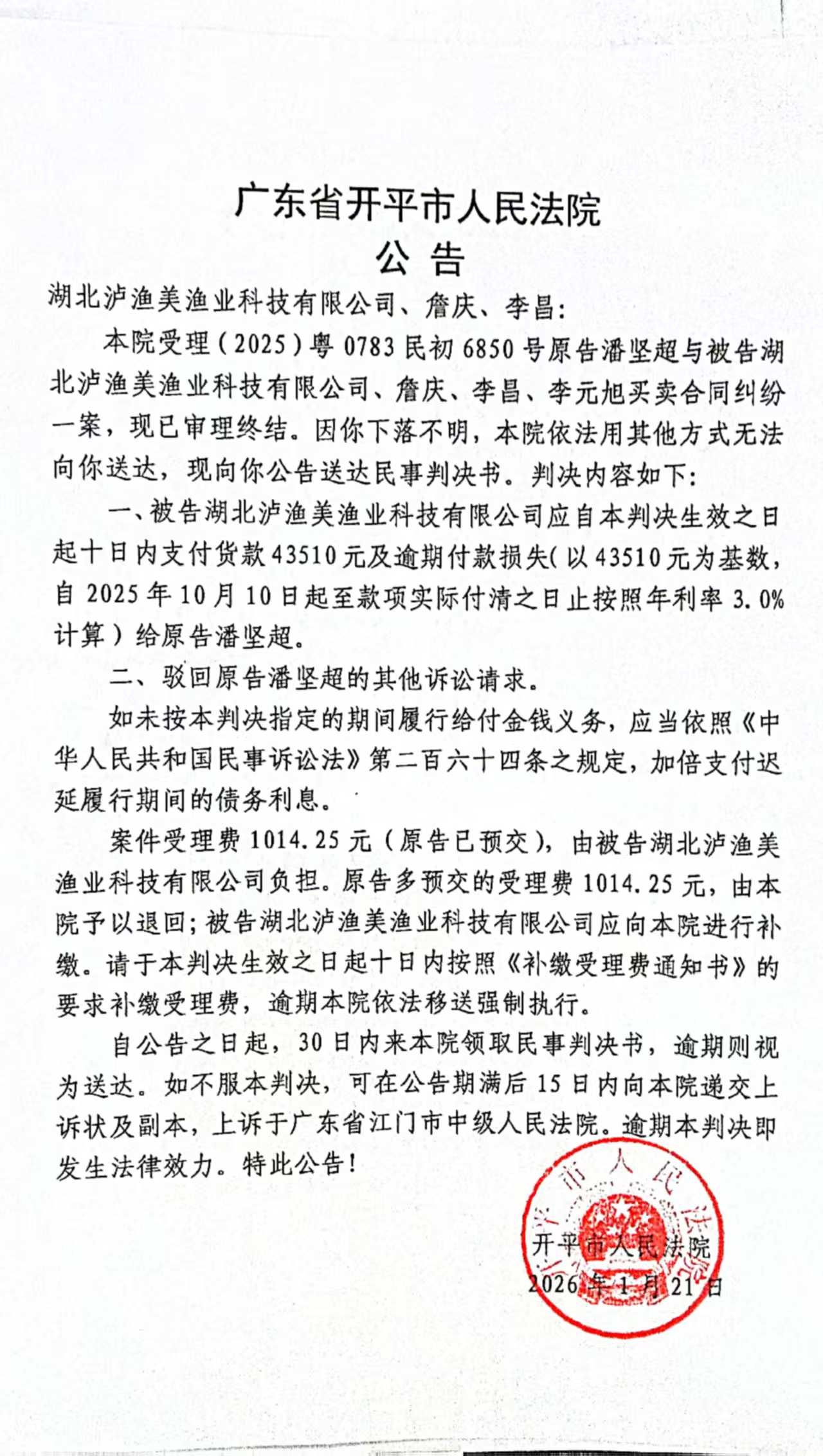 (2025)粤0783民初6850号 湖北泸渔美渔业科技有限公司、詹庆、李昌 判决公告