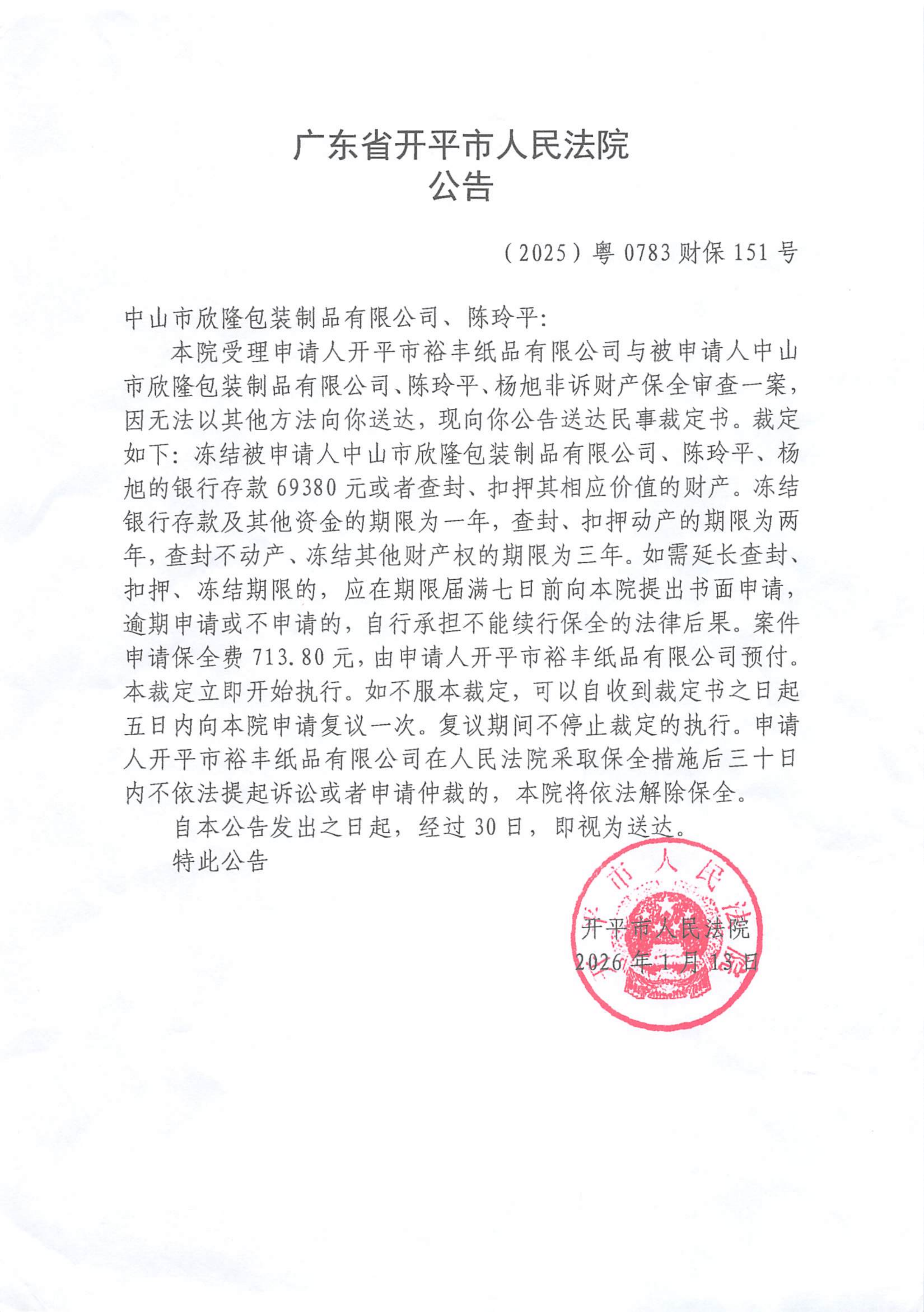 附件:(2025)粤0783财保151号 中山市欣隆包装制品有限公司、陈玲平 裁定公告.pdf