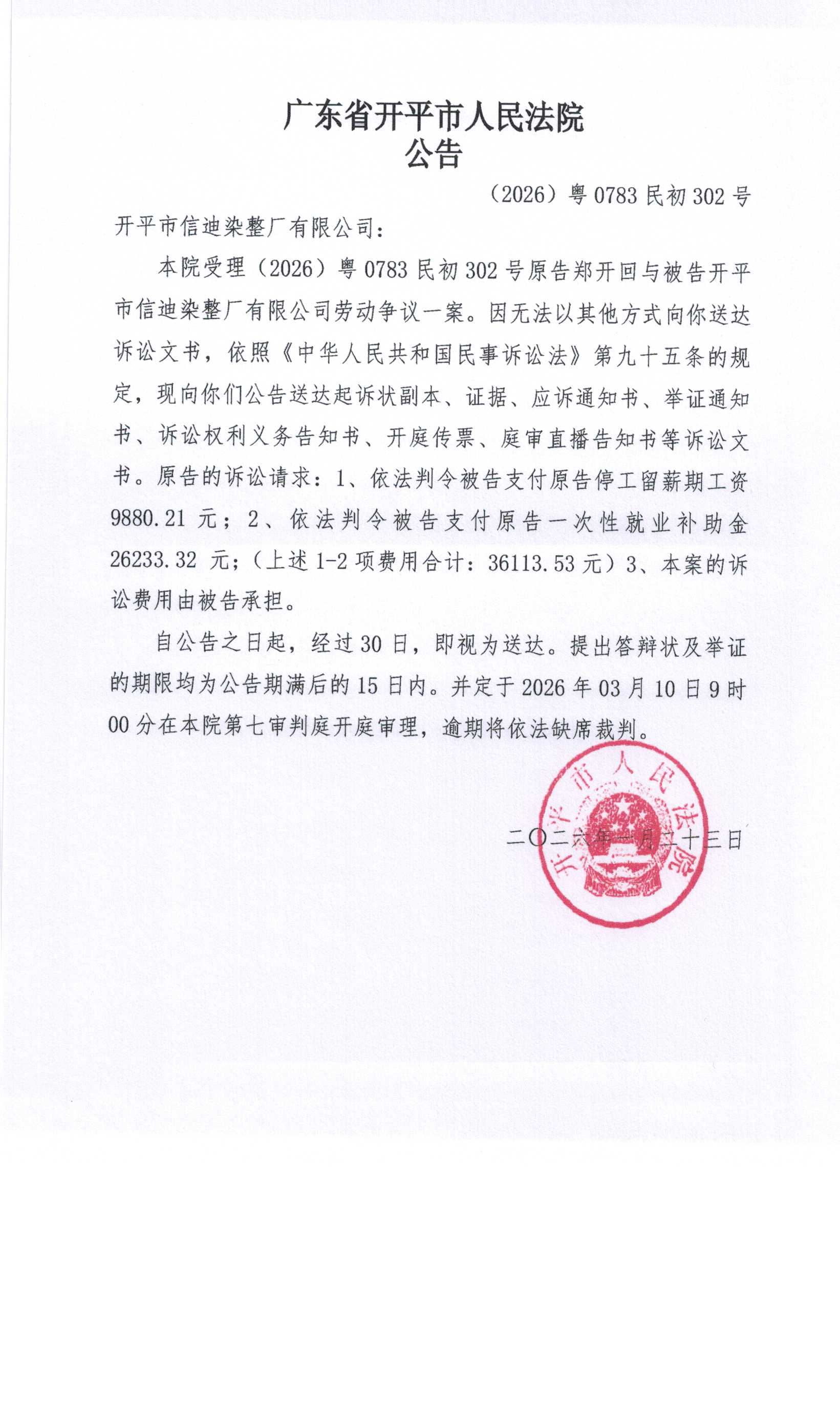 (2026)粤0783民初302号 开平市信迪染整厂有限公司 应诉公告.pdf
