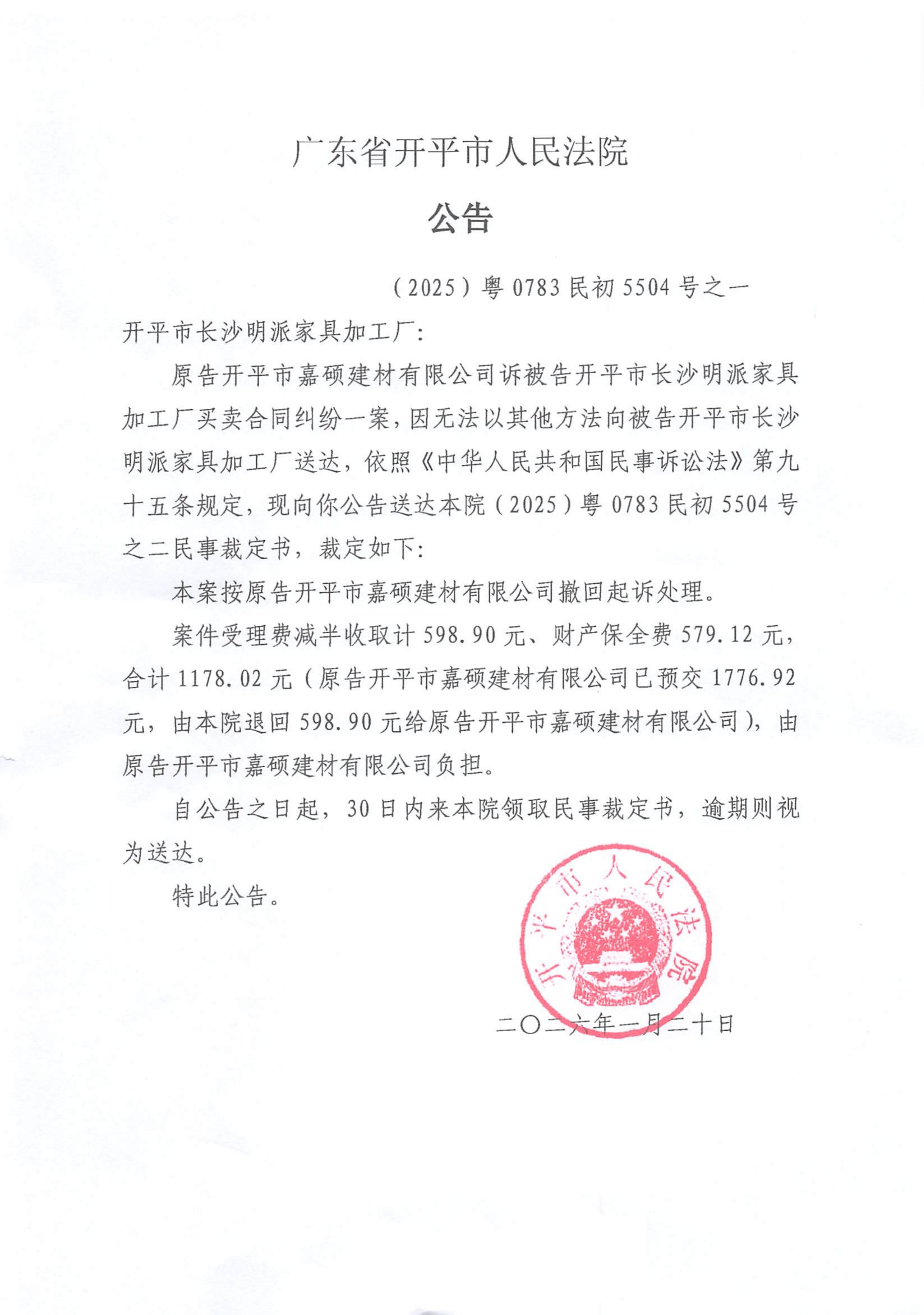 附件:(2025)粤0783民初5504号之一 开平市长沙明派家具加工厂 裁定公告.pdf