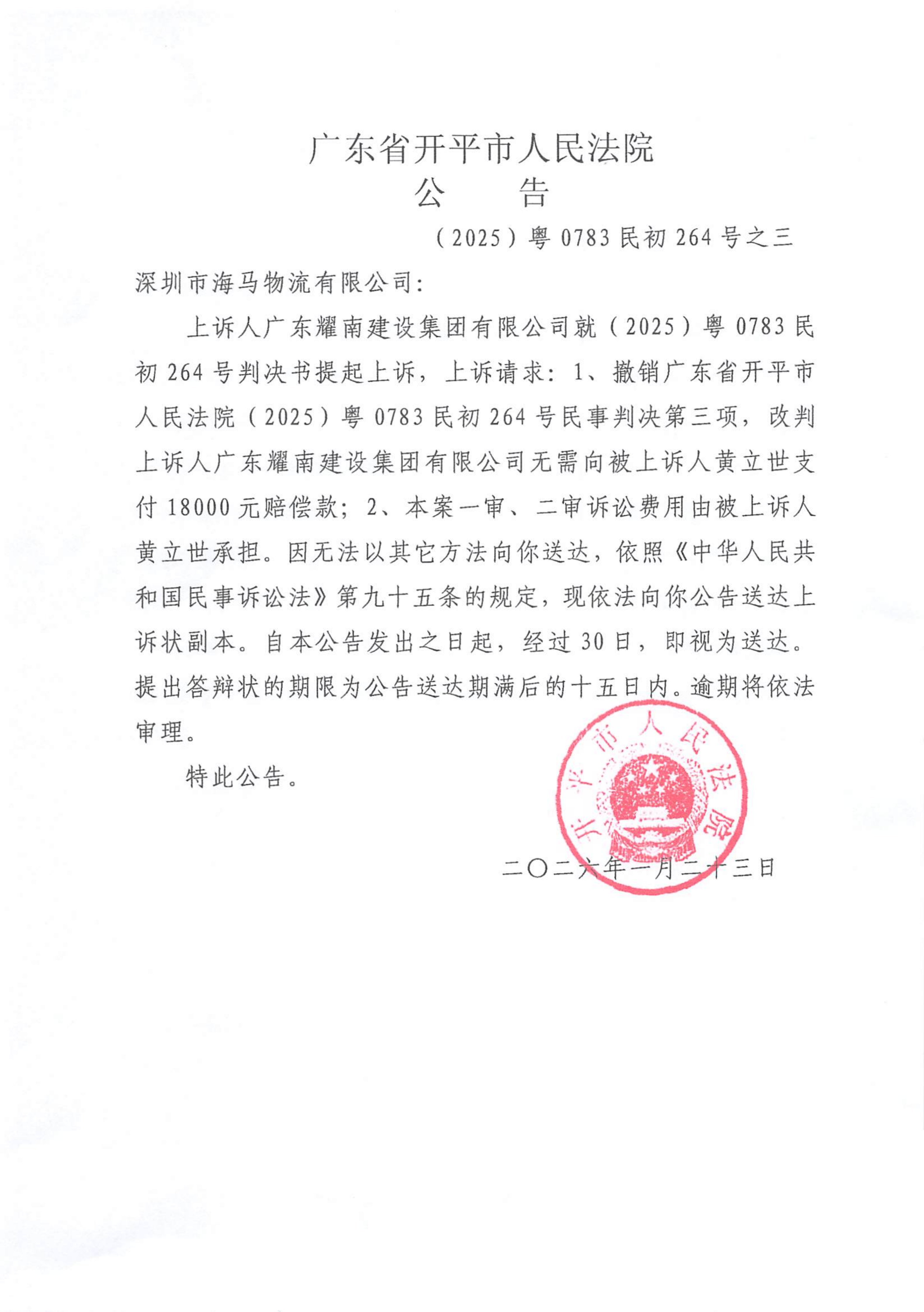 附件:(2025)粤0783民初264号之三 深圳市海马物流有限公司 上诉公告.pdf