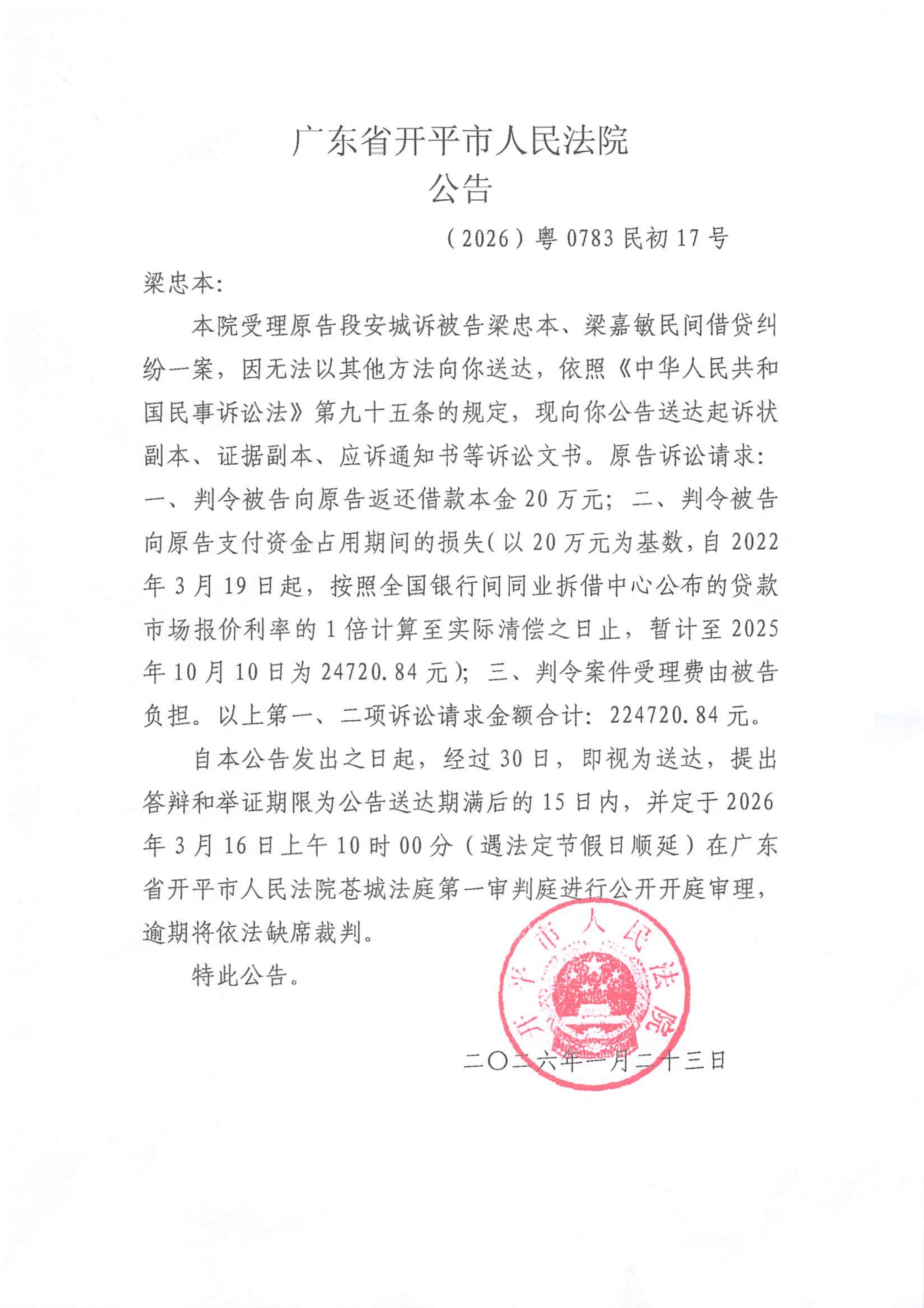 附件:(2026)粤0783民初17号 梁忠本 开庭公告.pdf