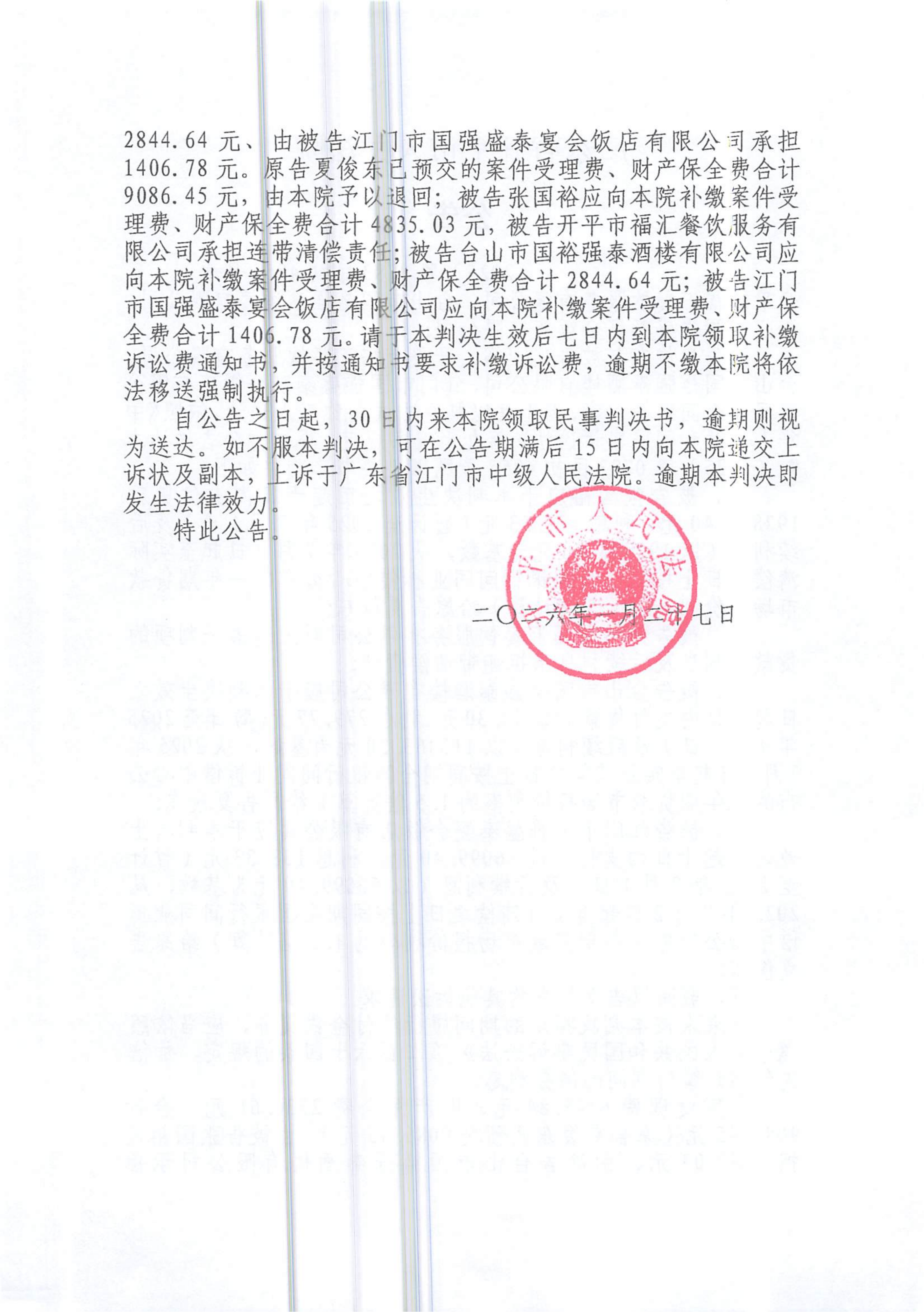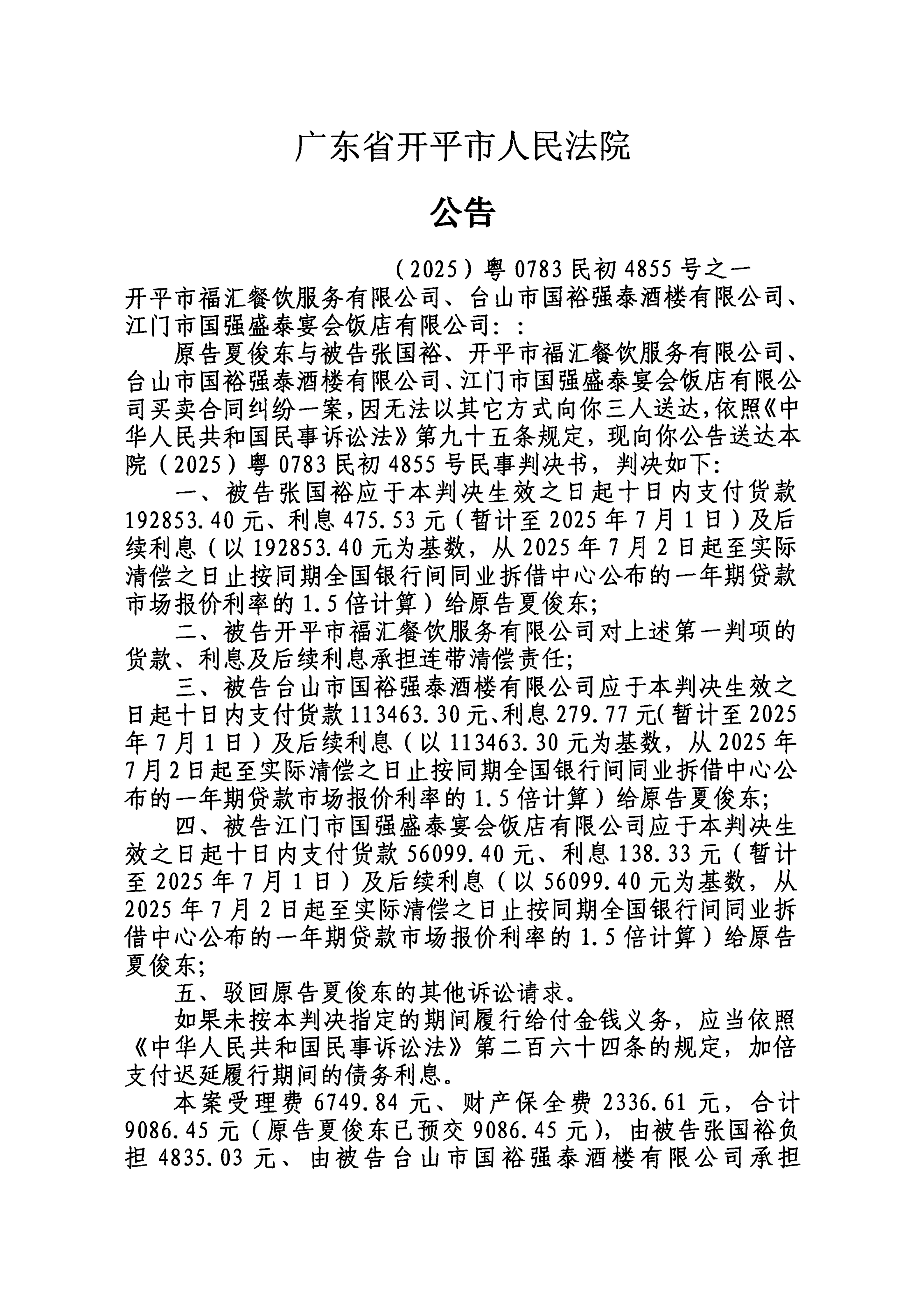 附件:(2025)粤0783民初4855号之一 开平市福汇餐饮服务有限公司、台山市国裕强泰酒楼有限公司、江门市国强盛泰宴会饭店有限公司 判决公告.pdf