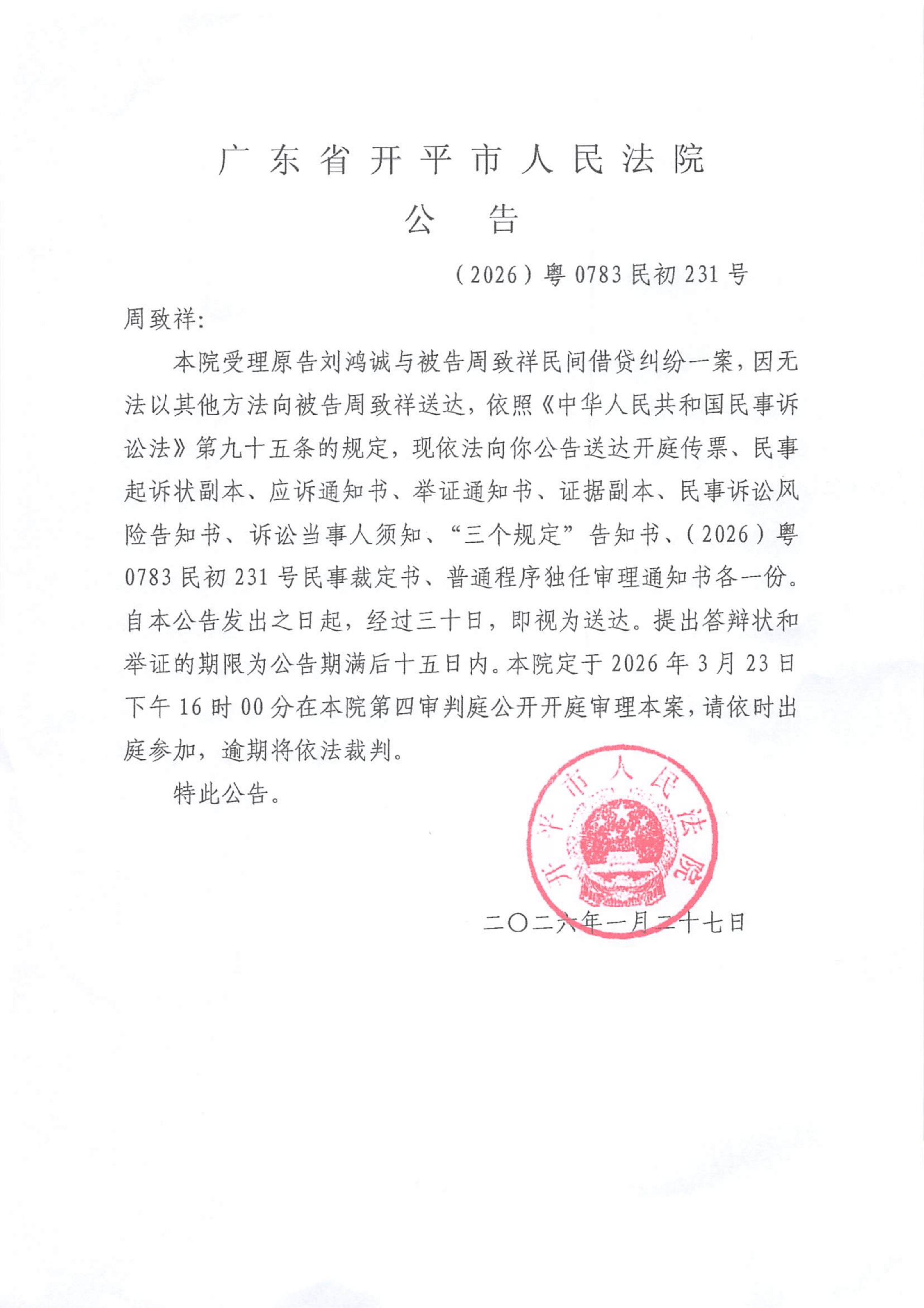附件:(2026)粤0783民初231号 周致祥 开庭公告.pdf