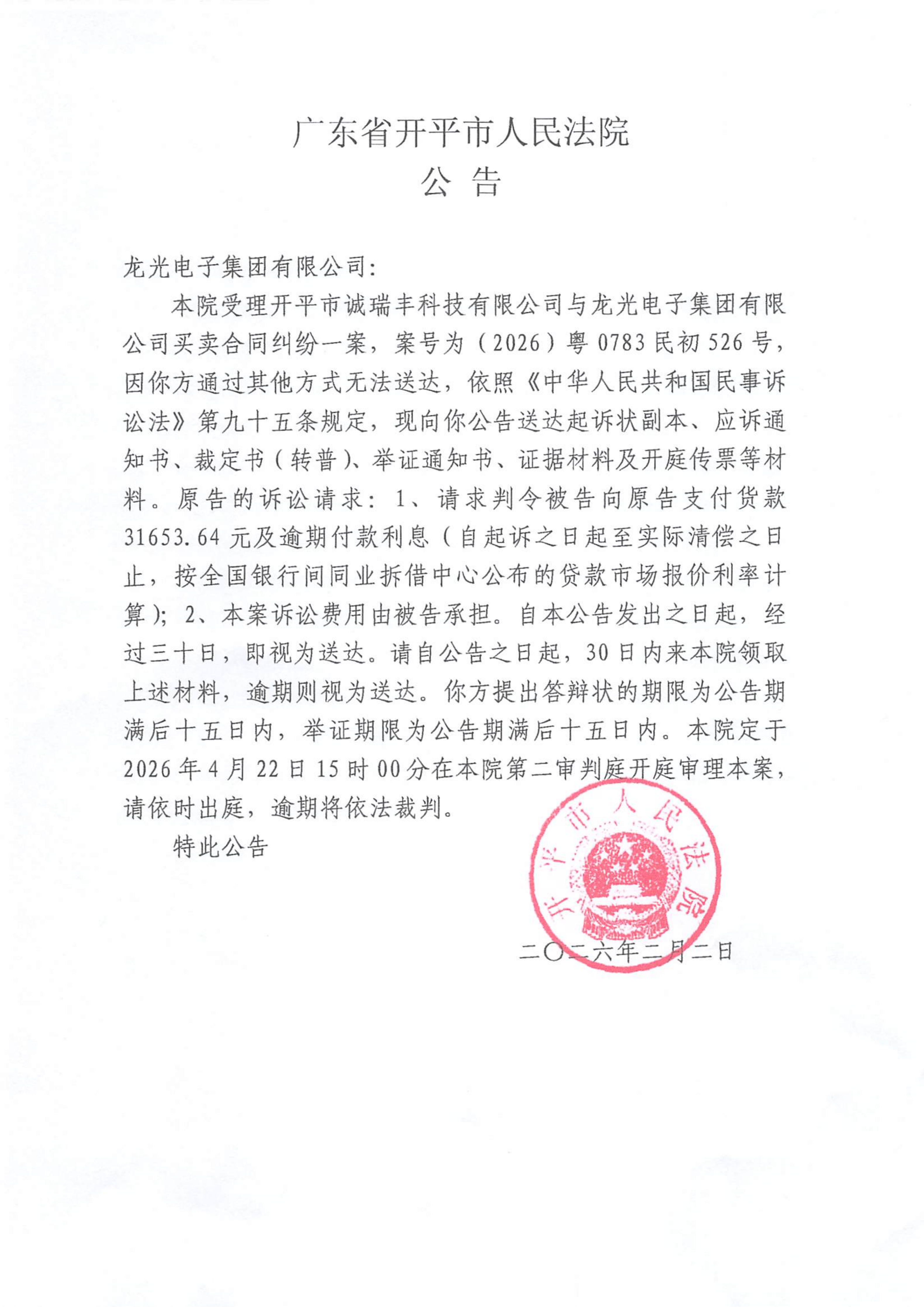 附件:(2026)粤0783民初526号 龙光电子集团有限公司 开庭公告.pdf