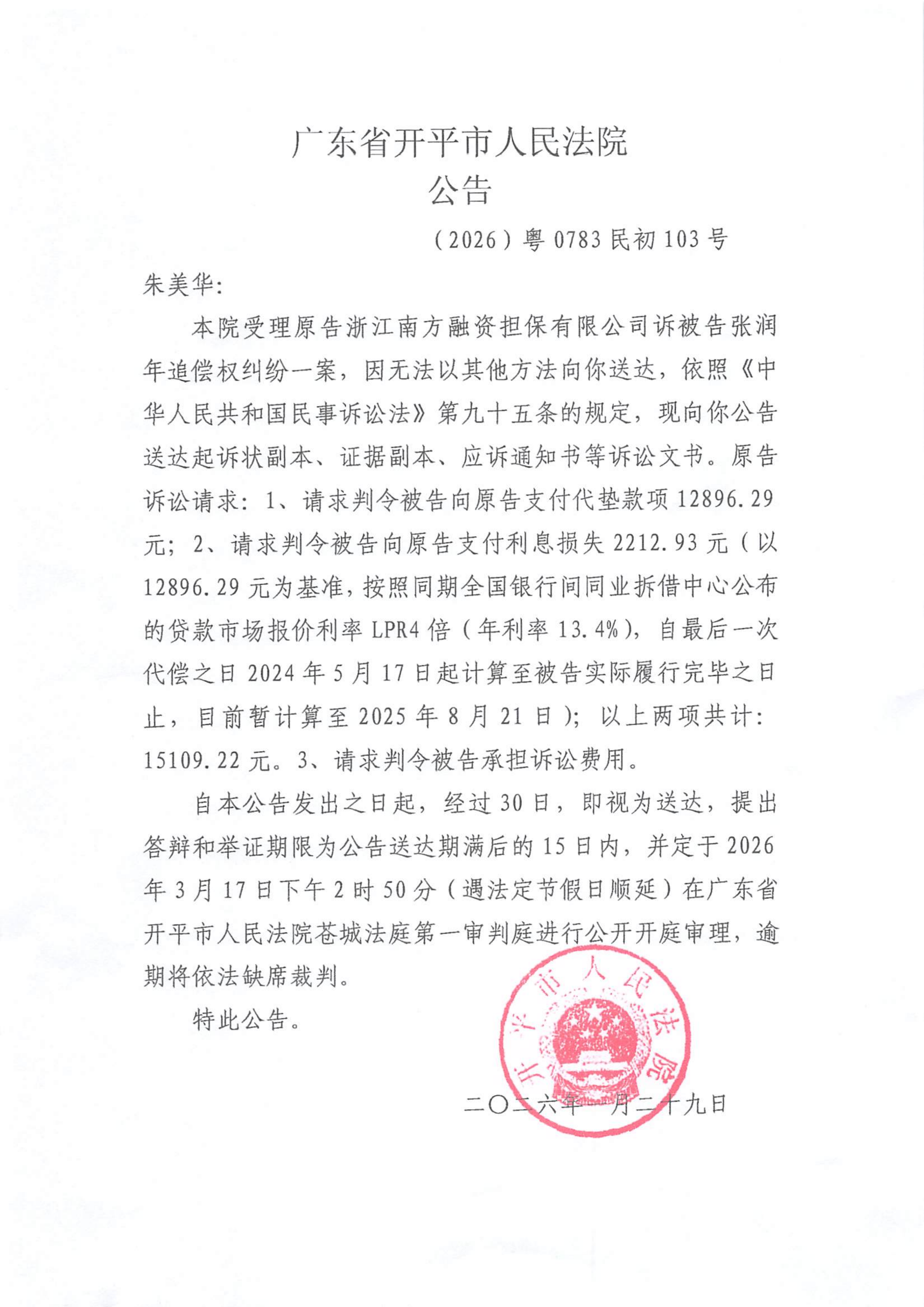 附件:(2026)粤0783民初103号 朱美华 开庭公告.pdf