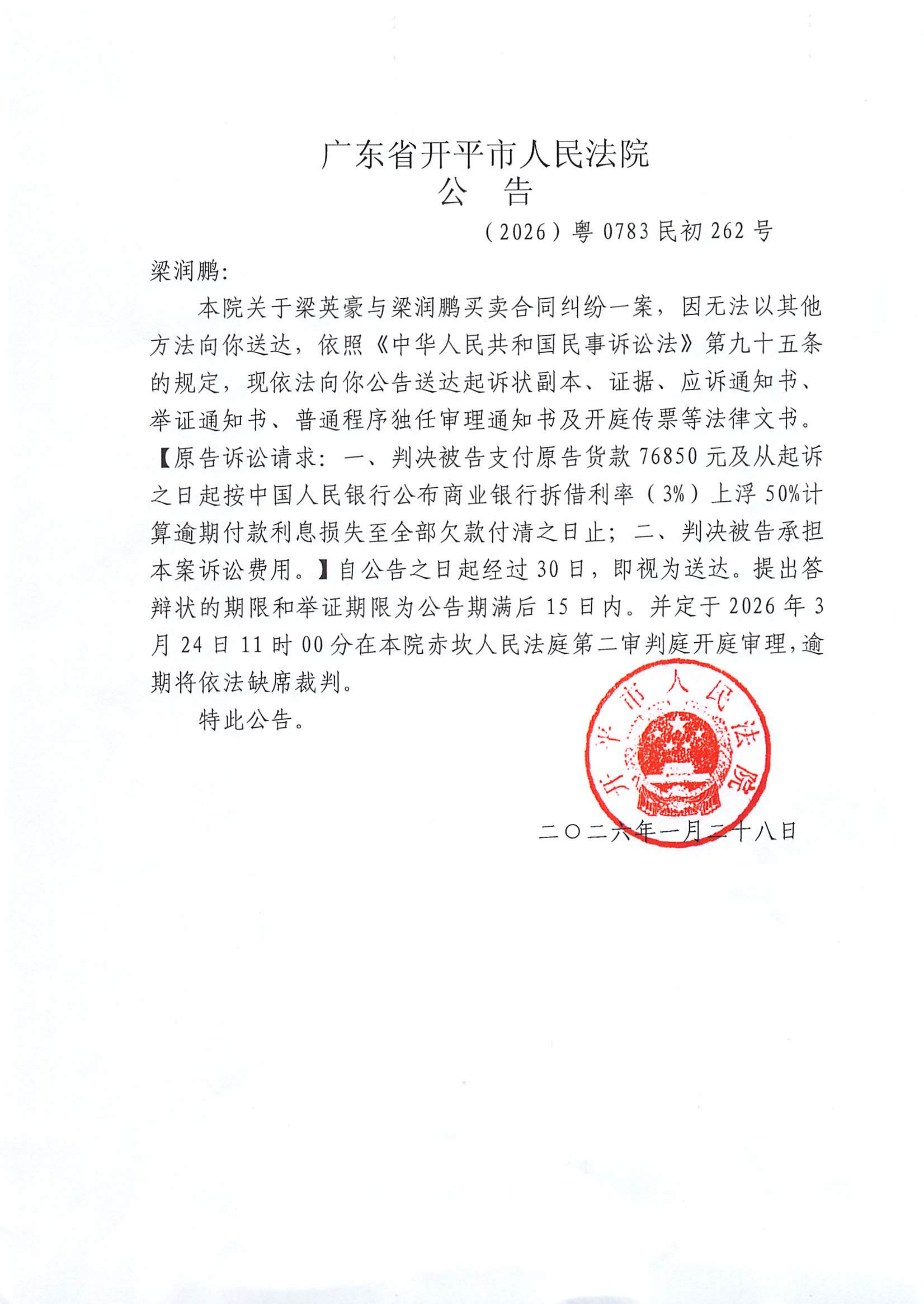 附件:(2026)粤0783民初262号 梁润鹏 开庭公告.pdf