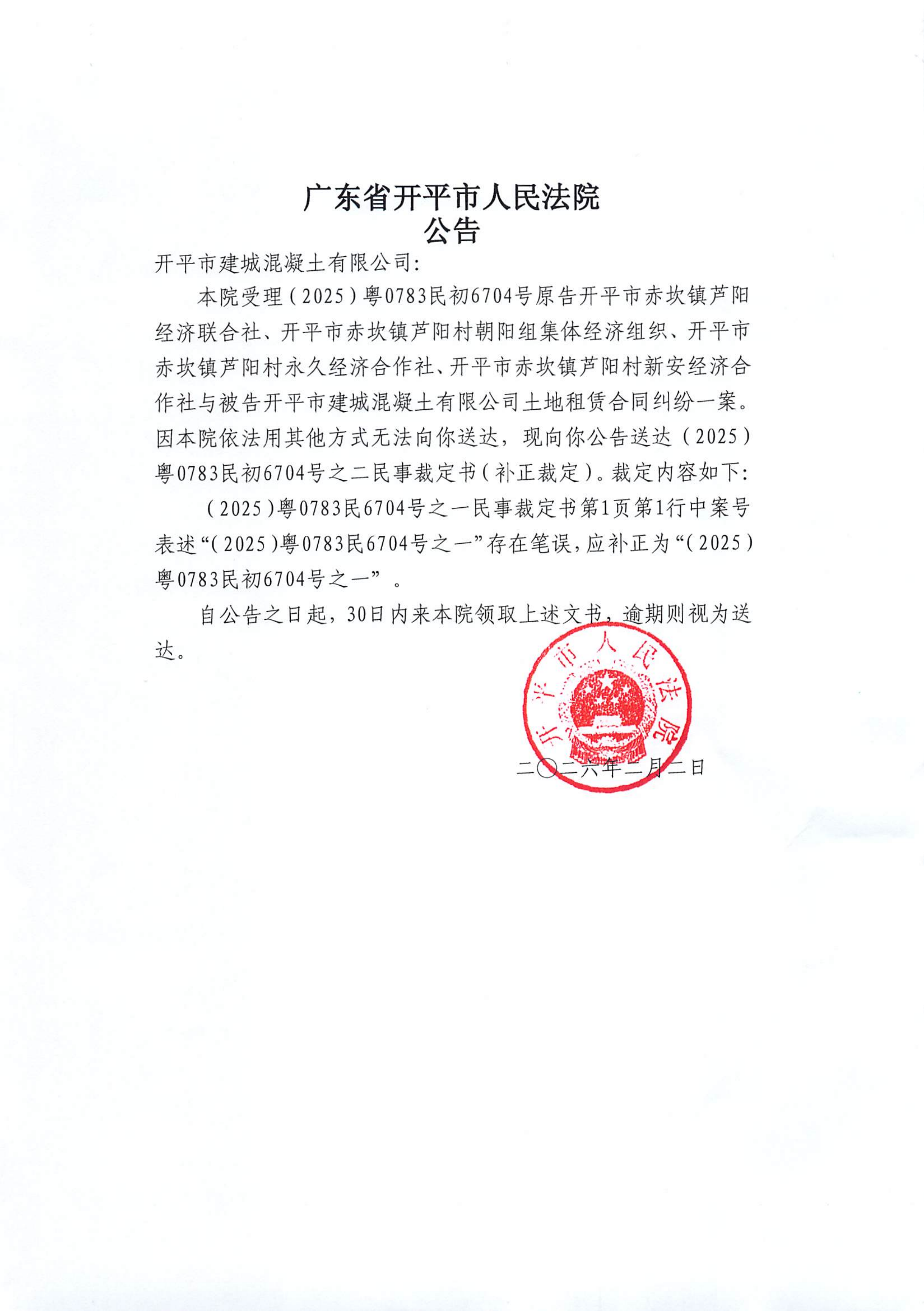 附件:(2025)粤0783民初6704号 开平市建城混凝土有限公司 补正裁定公告.pdf